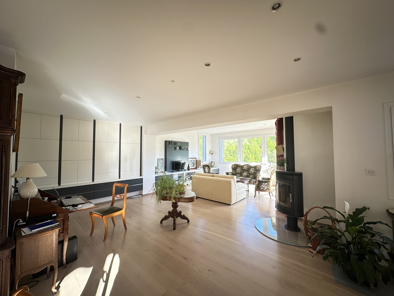Rez-de-chaussée : hall d'entrée, vaste salon/séjour (poêle à bois) avec accès terrasse, grande cuisine équipée, une chambre avec salle de bains (douche à l'italienne, vasque), un grand dressing, une chambre avec salle d'eau (douche), une petite pièce (bureau).
