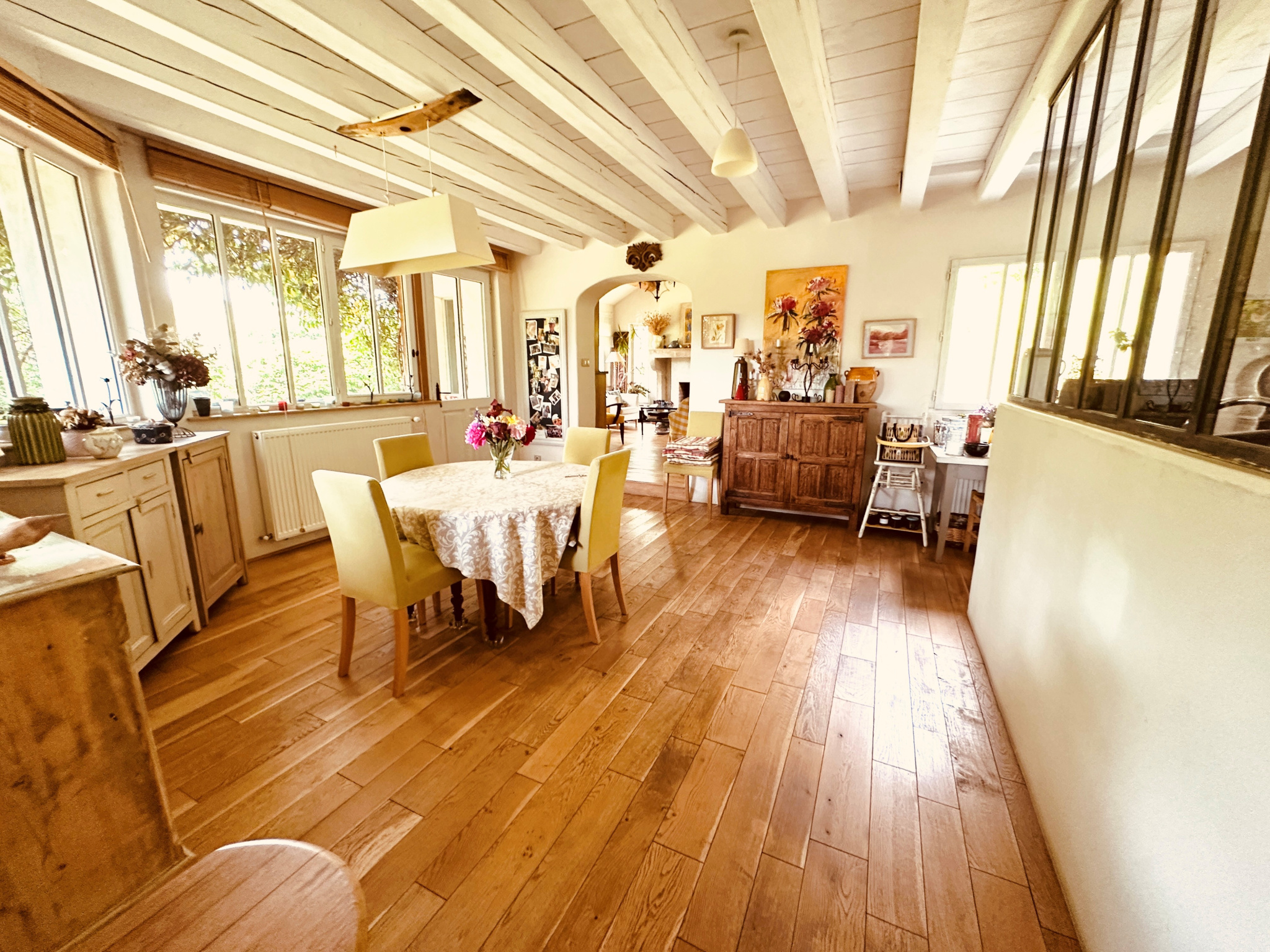 Dès l'entrée, vous serez séduit par les matériaux nobles : pierres apparentes, poutres majestueuses, cheminées fonctionnelles, salons chaleureux avec cheminées, salle à manger conviviale et lumineuse avec cuisine aménagée et équipée, séparée par une élégante verrière, complétée d'un cellier.