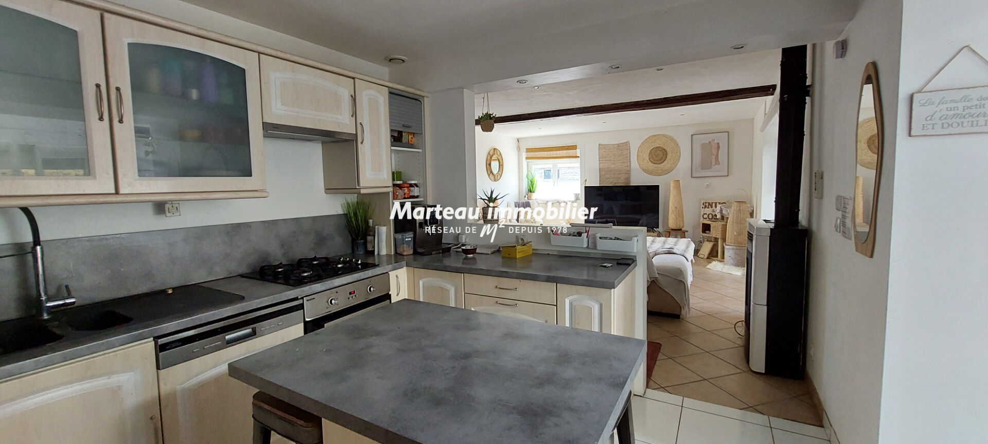 Au rez-de-chaussée : salon cosy avec poêle à granulés, cuisine moderne équipée, chambre et salle d'eau.