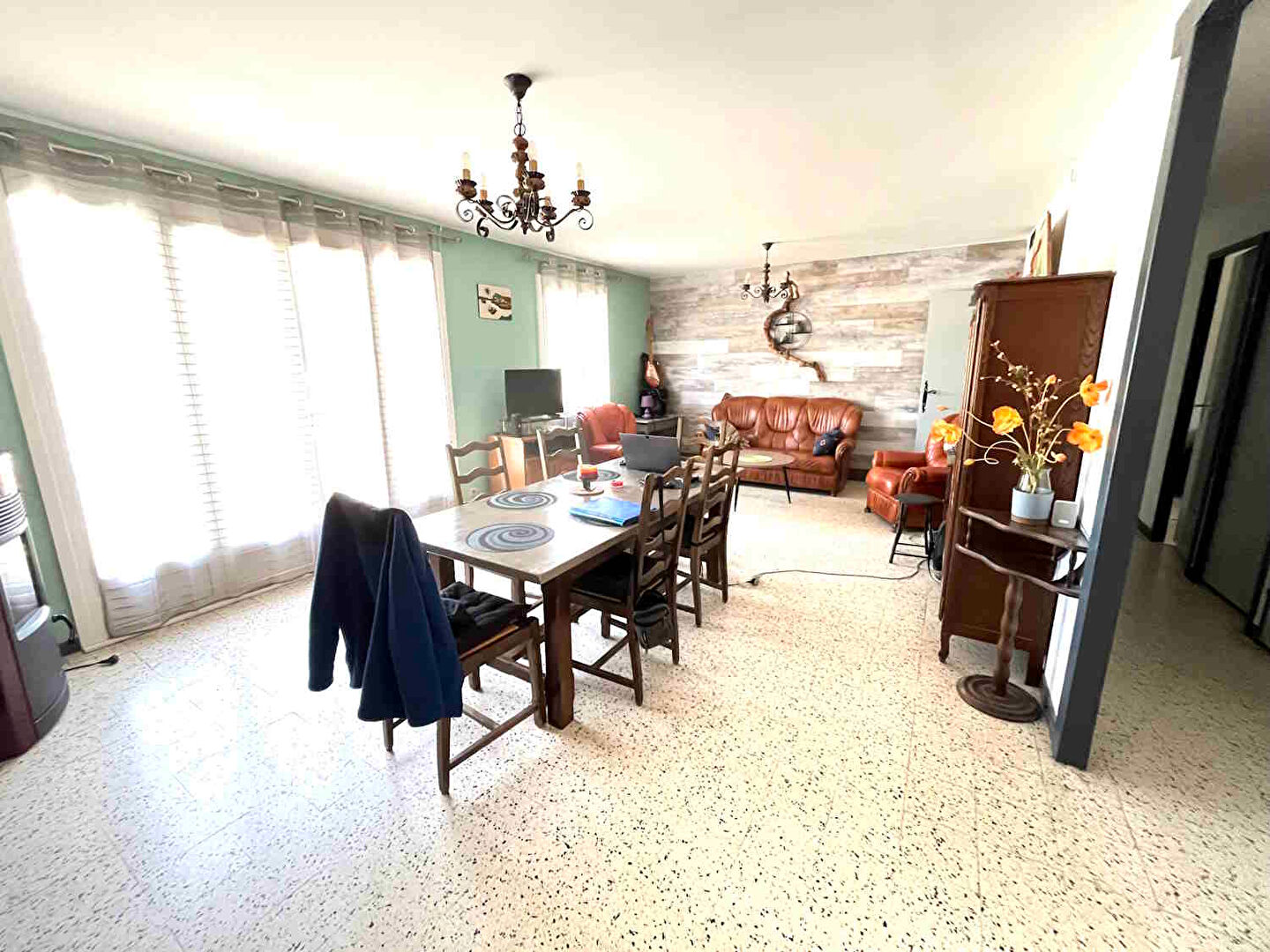 Elle se compose d'une entrée avec rangements, d'une cuisine indépendante entièrement équipée ouvrant sur une spacieuse terrasse de 20 m², d'un séjour lumineux avec poêle à granulés, de trois chambres confortables, avec placards, d'une salle d'eau rénovée et de toilettes séparées.