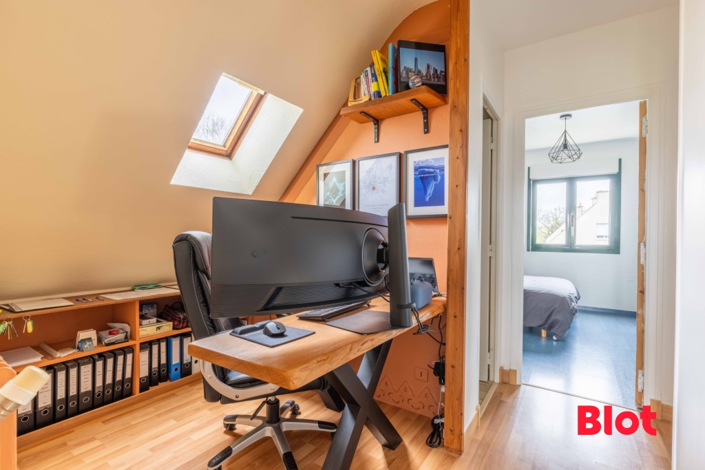 À l'étage, un palier aménagé en espace bureau constitue un cadre idéal pour le télétravail. Deux grandes chambres offrent confort et sérénité. Un dressing ainsi qu'un second WC indépendant viennent compléter cet espace nuit fonctionnel.