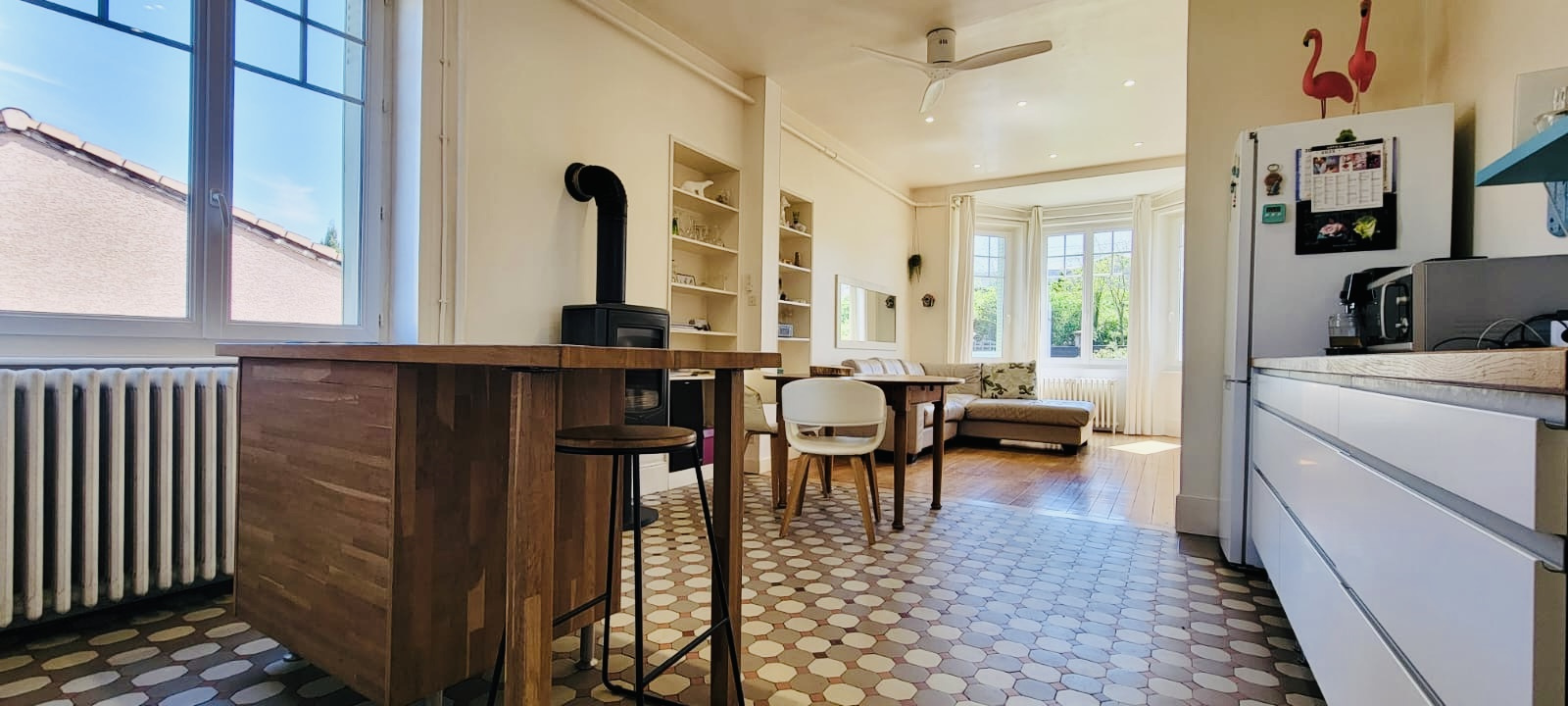 Au RDC cette demeure est composée d'une cuisine donnant sur un salon très lumineux,de 2 grandes pièces pouvant faire chambre ou bureau ou salle à manger,une salle d'eau avec W.C et une magnifique verrière donnant sur le jardin paisible et sans vis à vis.