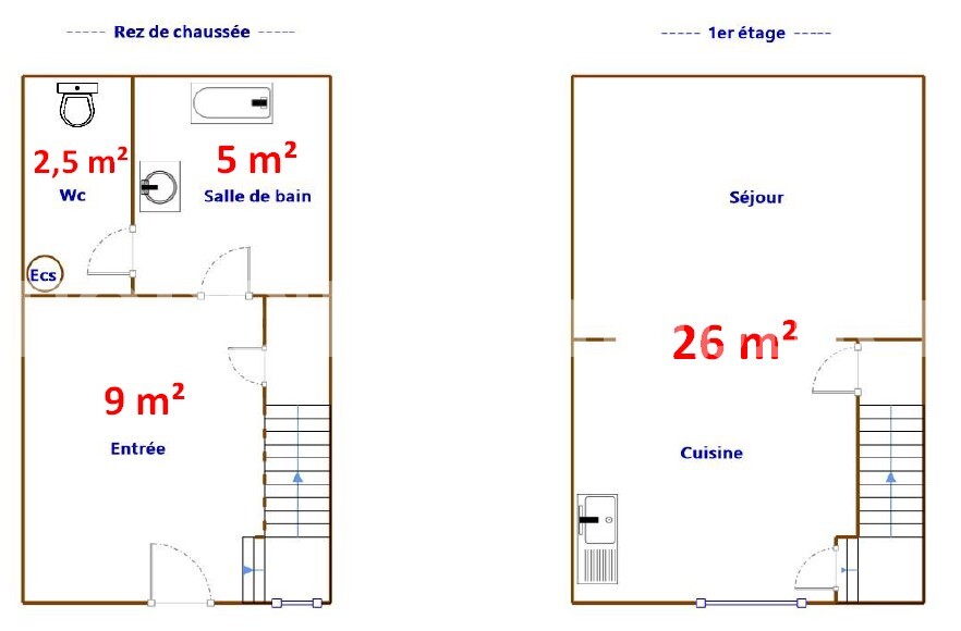 65 m² env. Pièce de vie. 2 chambres + mezzanine.