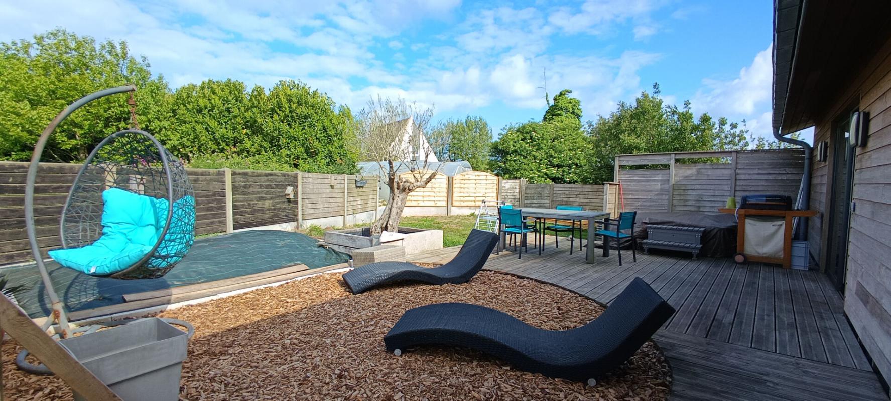 29880- PLOUGUERNEAU- je vous propose cette belle maison en bois de plain pied de 142m² située à proximité des commerces, commodités et écoles, elle vous séduira par son confort et ses volumes. Elle est composée d'une cuisine aménagée ouverte sur un salon/ séjour lumineux et spacieux, cinq chambres, un bureau, un cellier, une salle de bains ( douche, baignoire, double vasque), deux WC. Vous pourrez profiter d'une belle terrasse bien exposé équipée de son jacuzzi. Elle dispose également d'un bel atout, un studio indépendant de 20m²!!