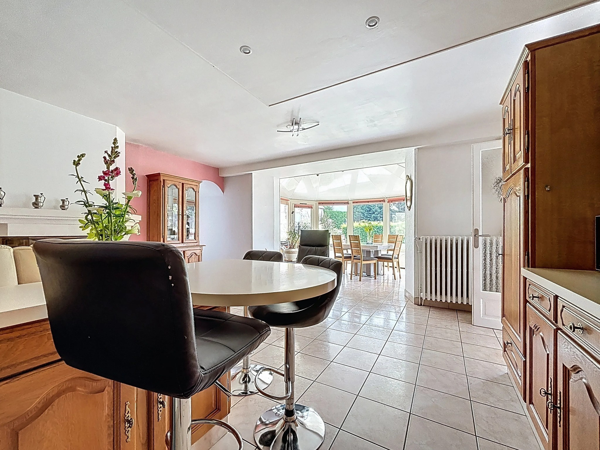 Vous trouverez au rez-de-chaussée une entrée accueillante, un séjour lumineux agrémenté d'une véranda et d'une cheminée insert, une cuisine ouverte, une salle à manger avec cheminée, une chambre de plain-pied avec salle d'eau privative, un WC indépendant, une buanderie et une arrière-cuisine.