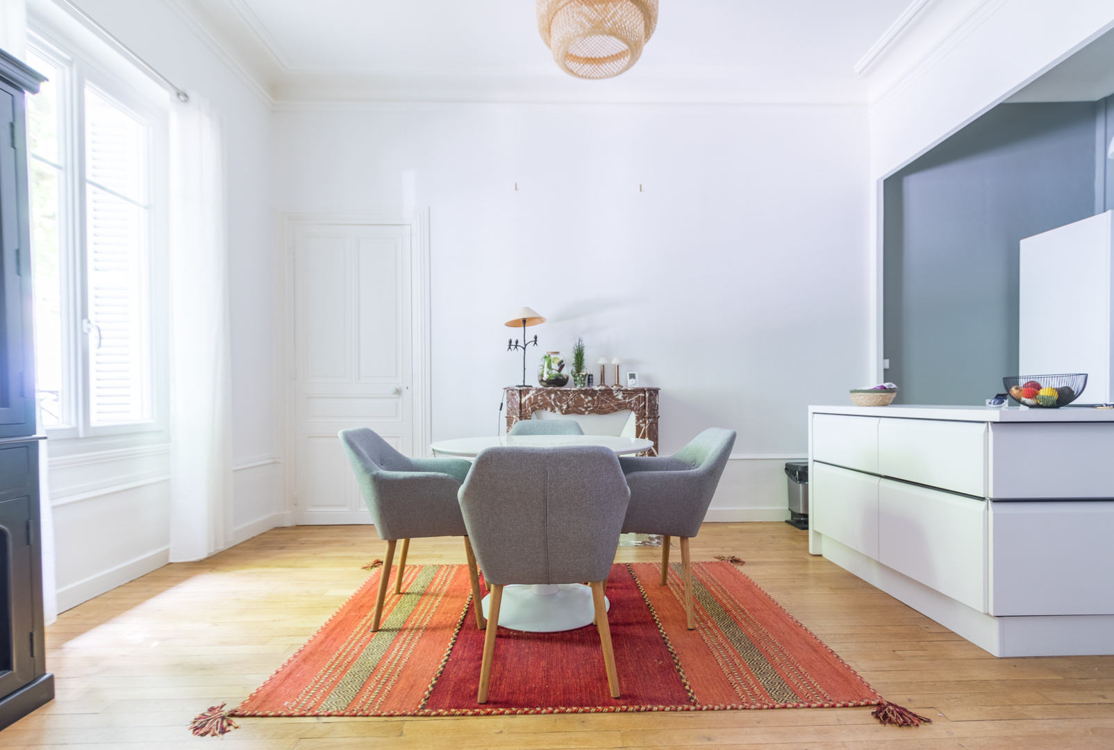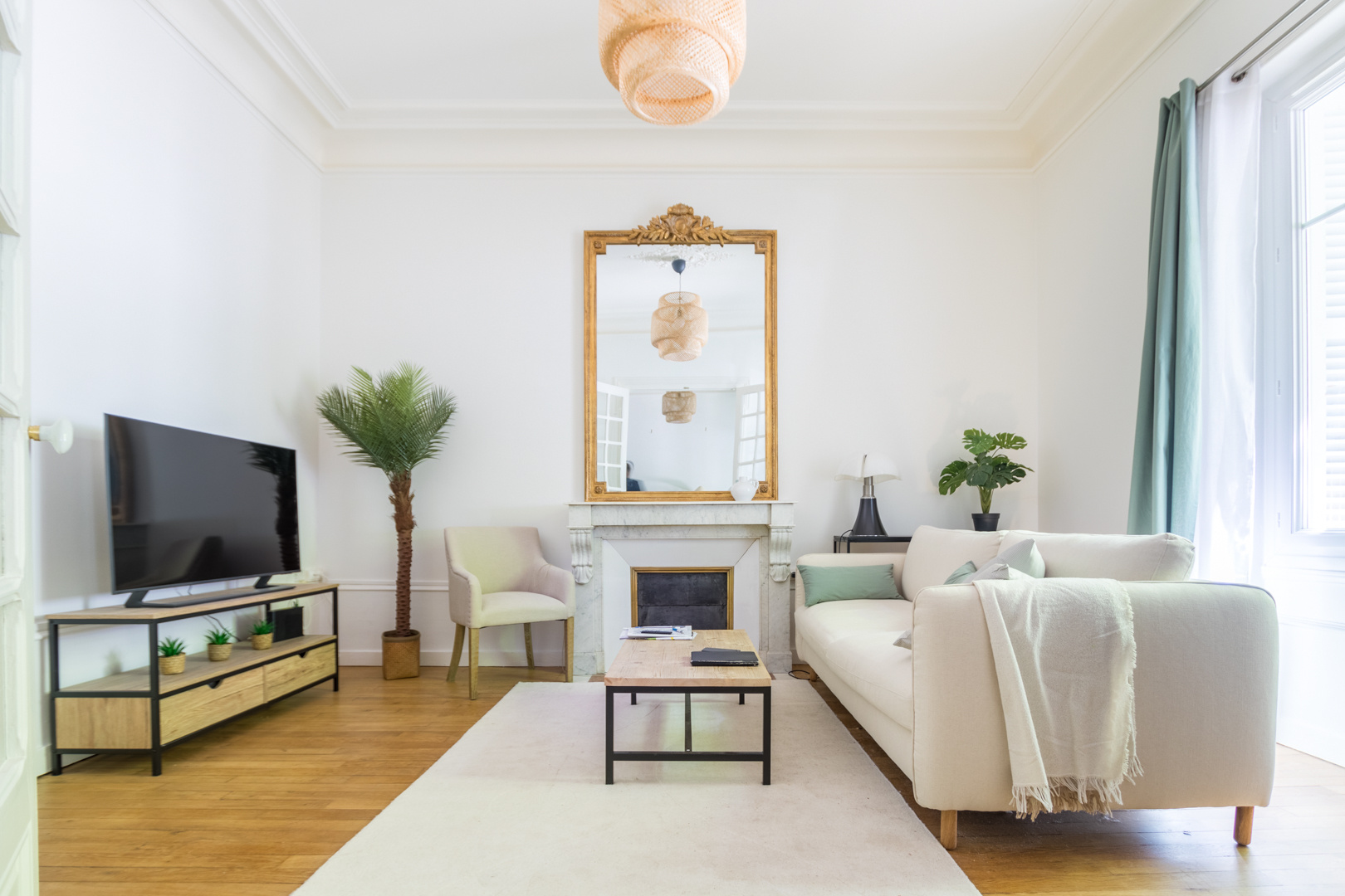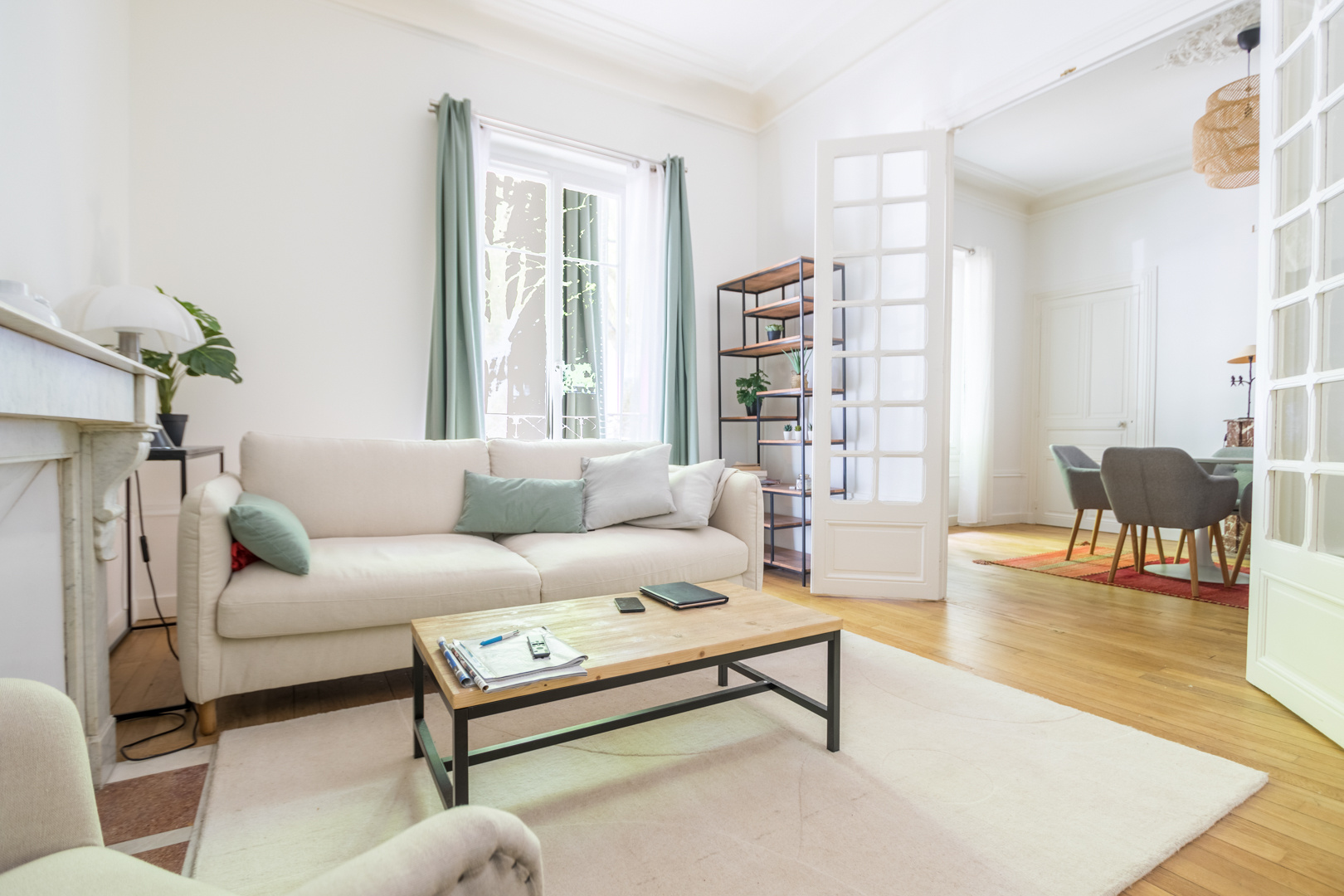 Dans très bel immeuble ancien, appartement entièrement rénové avec grande pièce à vivre, deux chambres, deux salles d'eau, dépendances et jardin commun. Beaucoup de cachet.