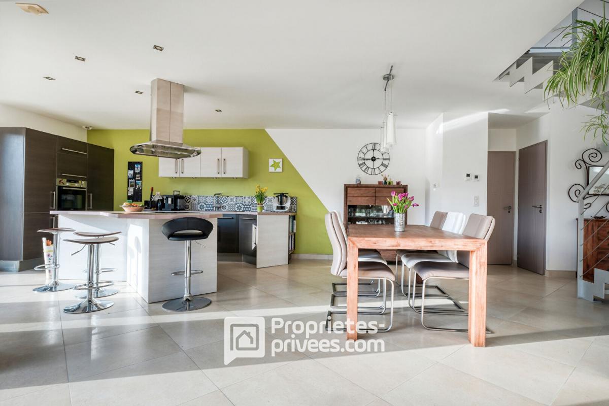 L'entrée donne sur une vaste pièce de vie de 70m2 environ, illuminée par de larges baies vitrées avec accès direct sur la terrasse de 70m2 (avec store banne) et les extérieurs (exposition Sud). On y retrouve une cuisine ouverte sur le séjour, aménagée et équipée d'un grand îlot, un coin repas pour la salle à manger, un espace salon avec poêle à bois, un wc indépendant suspendu, un dégagement avec placard d'entrée et une chambre de 14m2 avec sa propre salle d'eau.