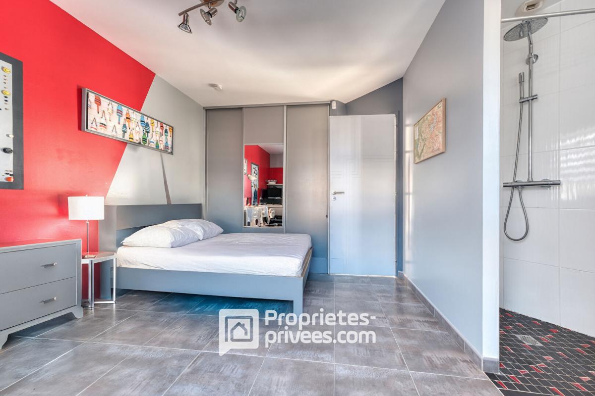 L'escalier en métal au design moderne dessert le 1er étage et mène sur une vaste mezzanine très lumineuse de près de 22m2 pouvant être un espace bureau ou un coin jeux pour enfants. Ce niveau dispose d'une salle d'eau avec grande douche à l'italienne, d'un wc indépendant suspendu, de trois chambres de 14m2 au sol chacune et d'une suite parentale de 32 m2 environ dotée d'un grand dressing et d'une salle de bains avec douche et baignoire îlot.