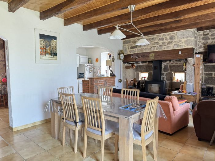 Dans un hameau au calme, à mi-chemin entre le lac de La Valette et la Dordogne, cette charmante maison typique en pierre, couverte en ardoises naturelles, offre une agréable vie de plain-pied. Au rez-de-chaussée, vous découvrirez une belle pièce de vie chaleureuse avec son authentique cantou et sa cuisine semi-ouverte, une chambre confortable, une salle d'eau et un WC indépendant. À l'étage, un vaste palier aménagé en salon dessert deux chambres supplémentaires, ainsi qu'un second point d'eau avec WC. Cette maison dispose également d'une cave ; idéale pour le rangement ou la conservation. À l'extérieur, vous profiterez d'un agréable coin terrasse intimiste agrémenté d'un puits, d'un abri de jardin, d'un grand garage indépendant mais aussi des places de stationnement privatives. La maison bénéficie d'un système de chauffage performant par pompe à chaleur, avec un complément bois pour plus de convivialité. Assainissement individuel conforme.