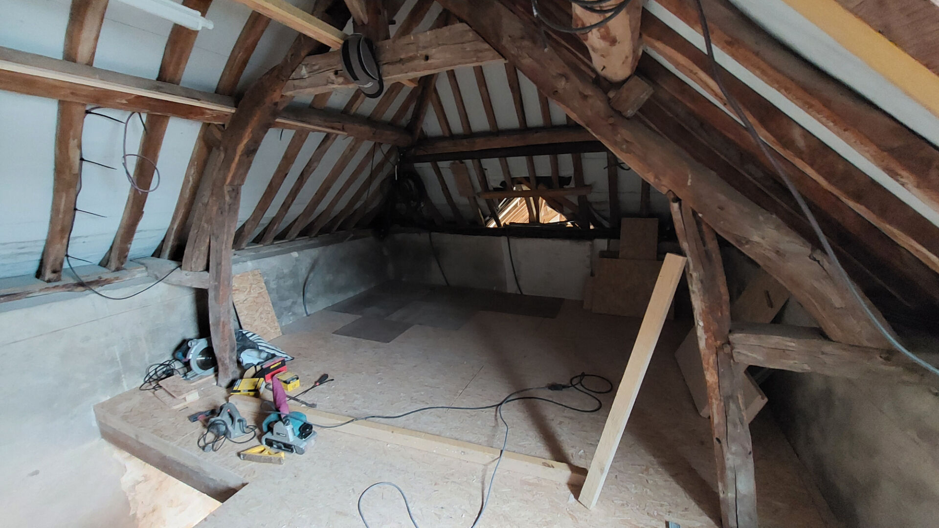 Divers travaux ont déjà été réalisés tels que la couverture en ardoise, les huisseries mixtes en PVC et Aluminium, une partie des planchers, abattage de certains murs, le solivage des sols, les joints pour les murs en pierre...