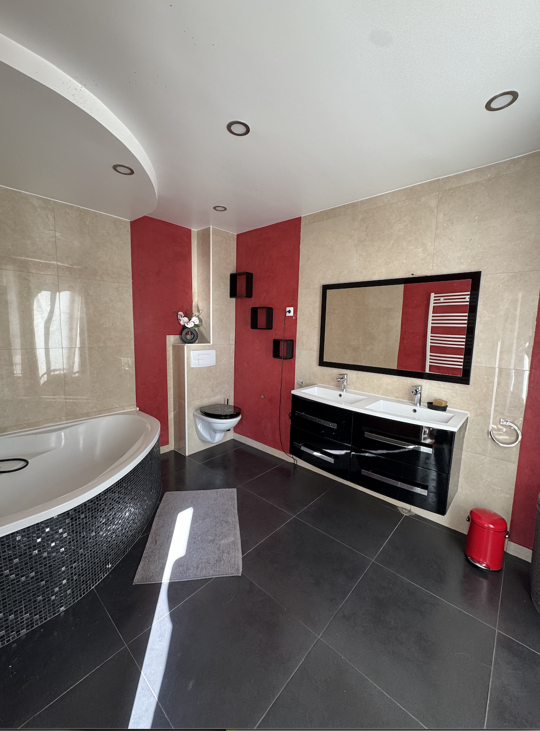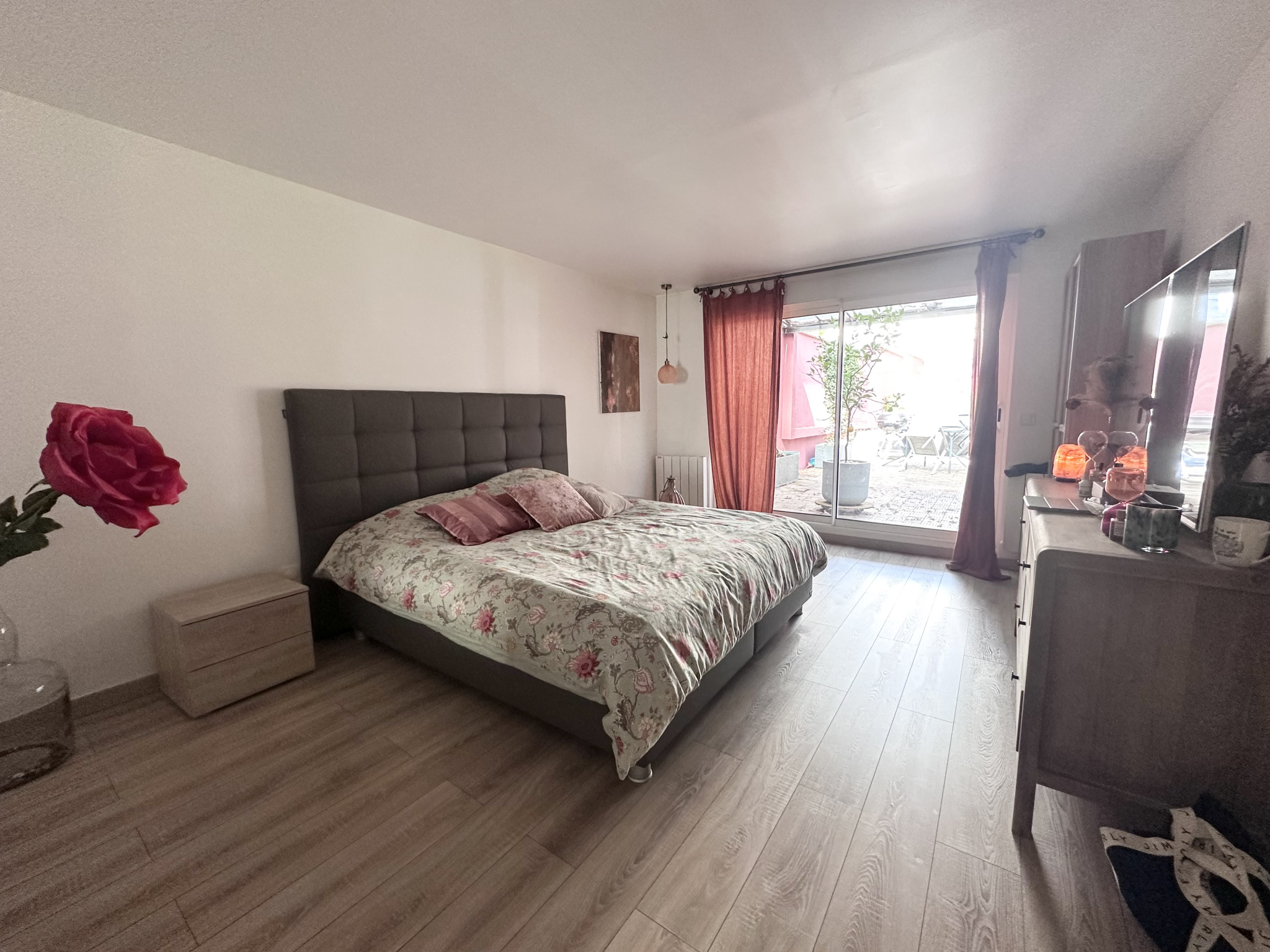 Au premier étage : Une chambre avec plusieurs rangements, une salle de bain avec WC de plus de 8m2 et une grande terrasse de 24m2.