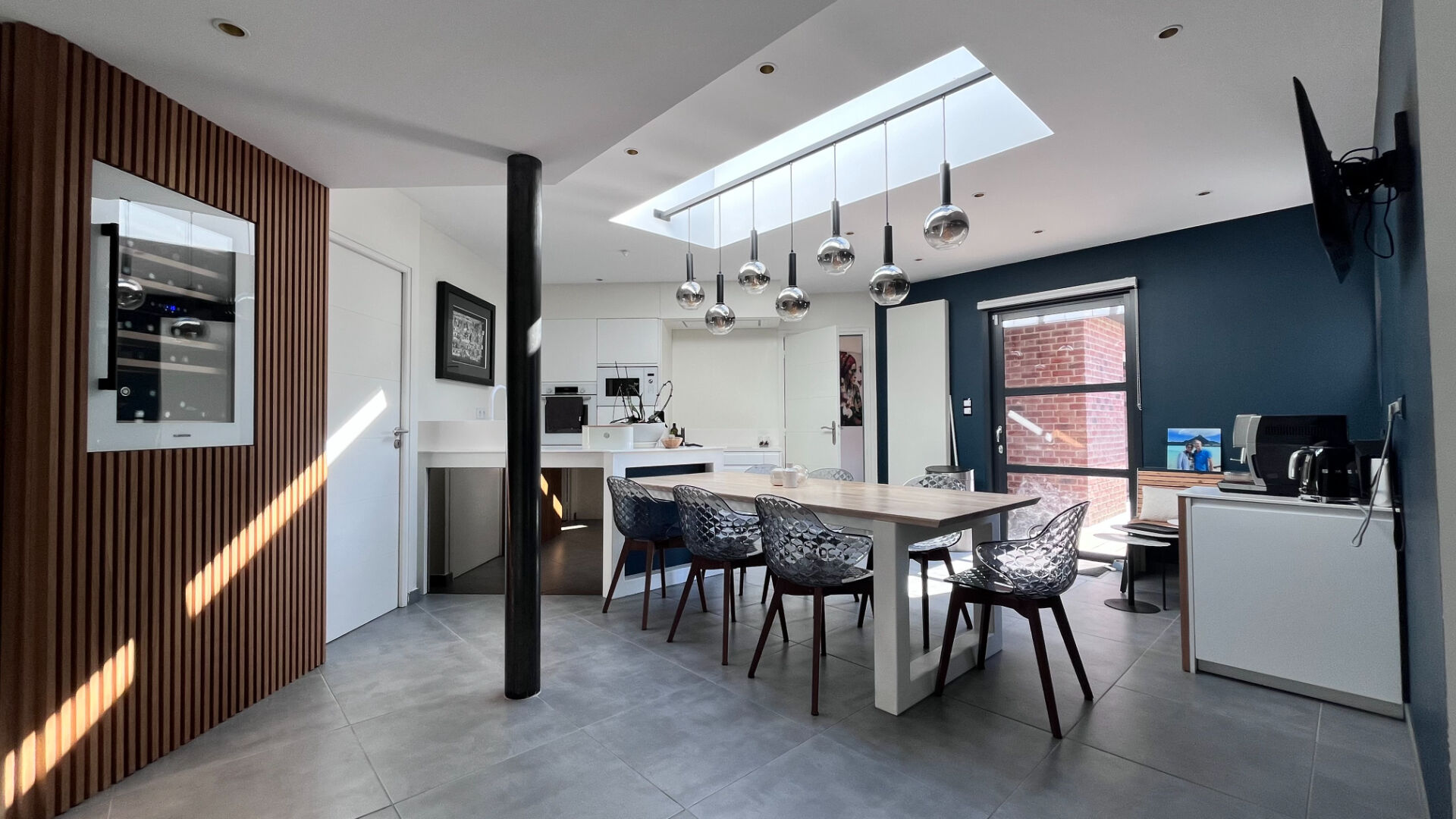 Vous retrouvez une cuisine attenante équipée et dinatoire, en prolongement un espace buanderie ainsi que l'accès à un quadruple garage.