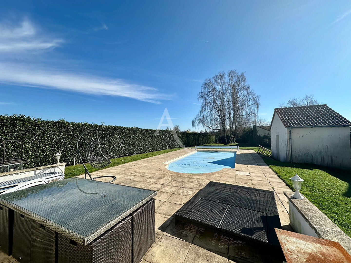 -À l'extérieur, profitez d'une vaste terrasse d'environ 100 m², parfaite pour vos moments de détente, donnant sur une piscine cressée, couverte, avec dispositif de sécurité et local technique.