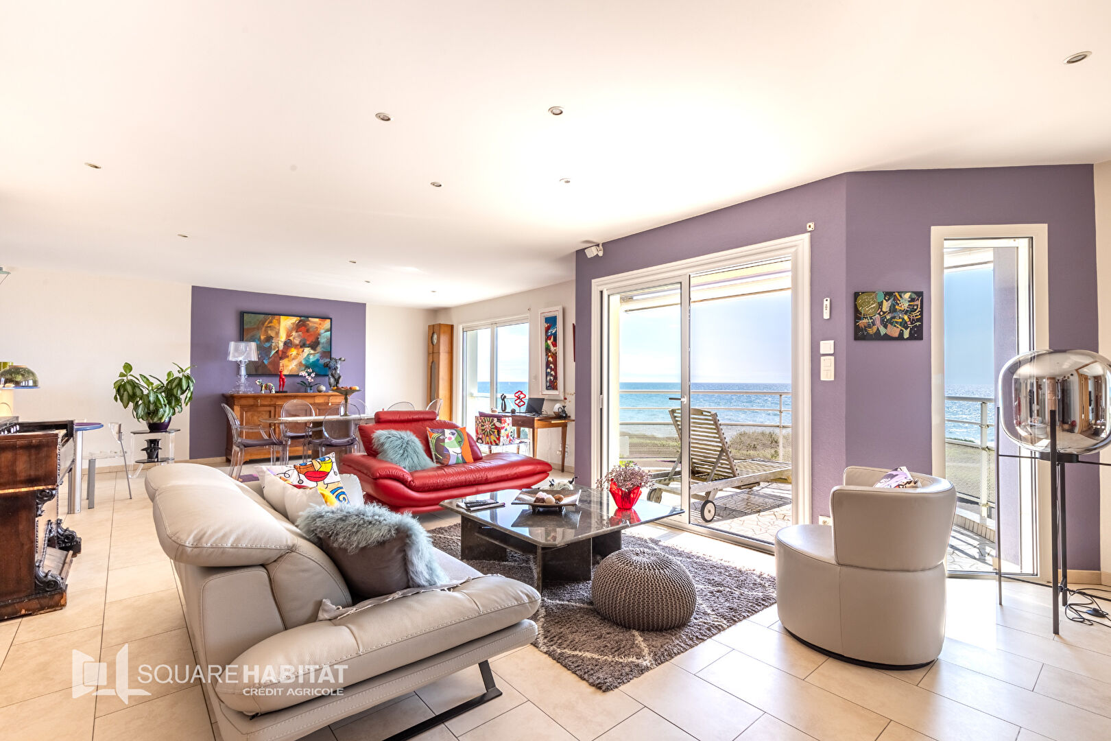 Superbe double séjour baigné de lumière, avec de grandes baies vitrées coulissantes offrant une vue à couper le souffle sur l'océan