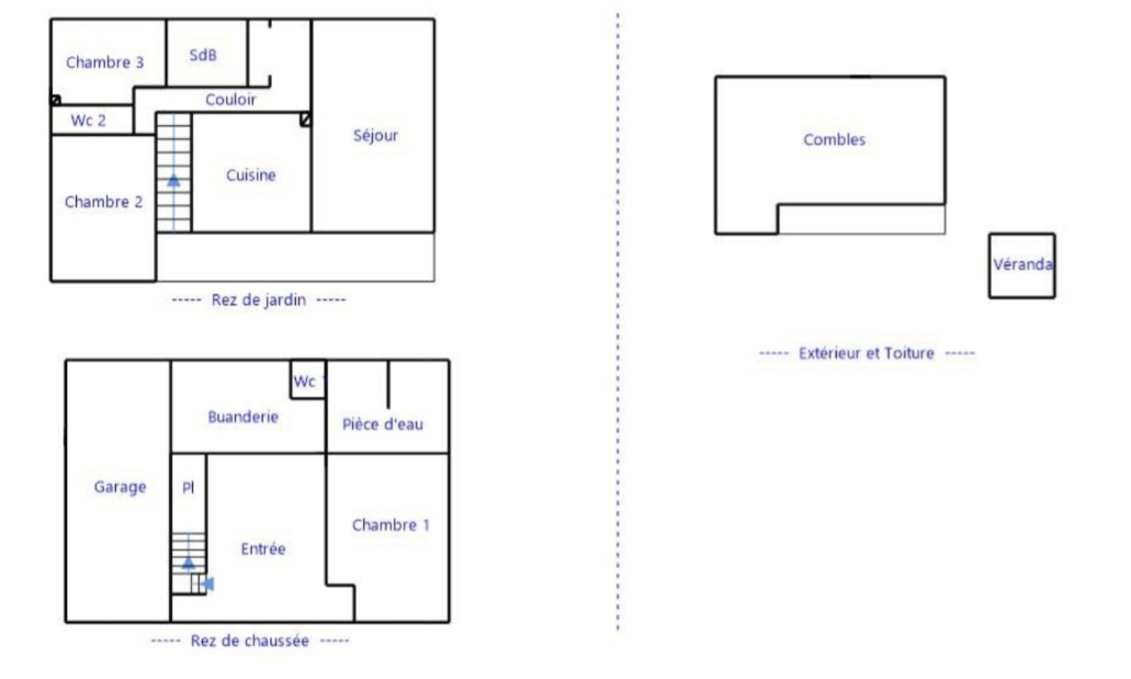 Rez-de-chaussée : entrée, couloir, séjour double, cuisine, deux chambres, WC.