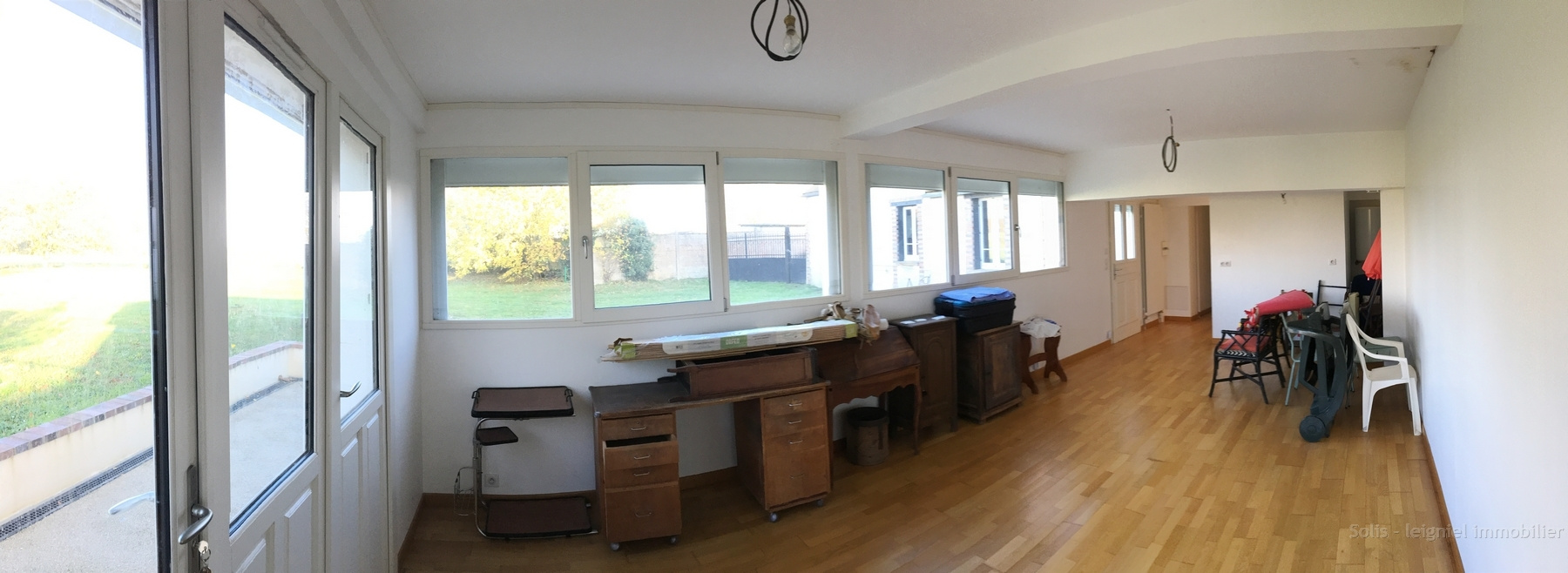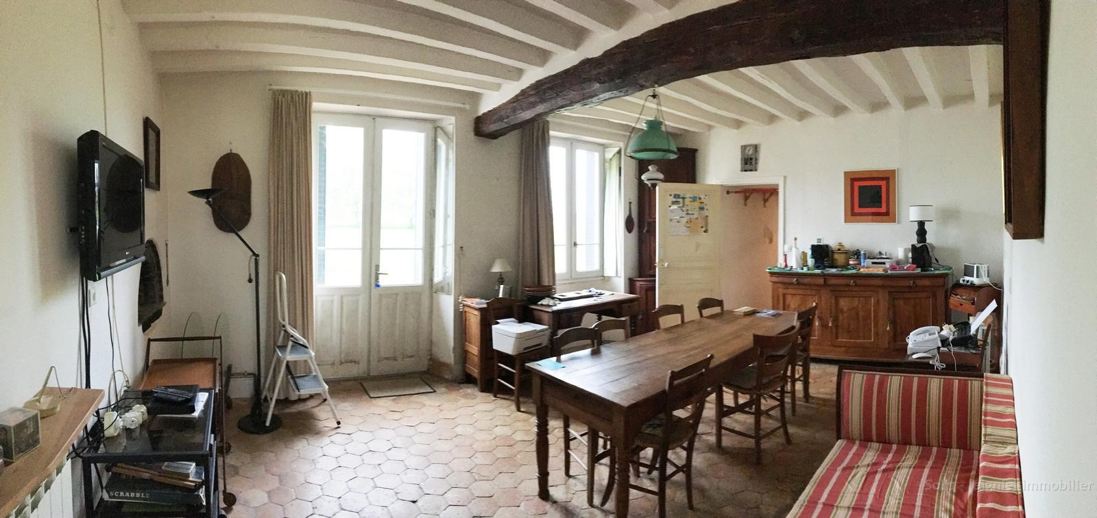 Exposée au sud, une cour d'accueil vous permet d'accéder à la maison: l'entrée dessert un salon de 28 m2 avec sa cheminée insert, une grande salle à manger suivie de la cuisine, et 2 chambres de plain pied. (les sols de ces pièces sont revêtus de belles tomettes en terre cuite ou de parquets en chêne). En prolongement du salon, une vaste pièces lumineuse de 42m2, récemment rénovée, avec salle d'eau PMR et WC) entourée de sa terrasse en béton désactivé, permet de loger une personne à mobilité réduite ou d'y installer un atelier, un bureau ou une salle de jeu avec une belle vue sur le jardin.Côté cuisine, une grande pièce à usage de rangement/cellier/buanderie dessert une 2ème salle de bains avec WC et l'escalier menant à l'étage.Au premier, un palier avec WC dessert 2 chambres dont une avec un bow window et sa belle vue campagne. Bureau entre les chambres menant à un vaste grenier de 70 m2 au sol. Belle cave voûtée sous la maison.