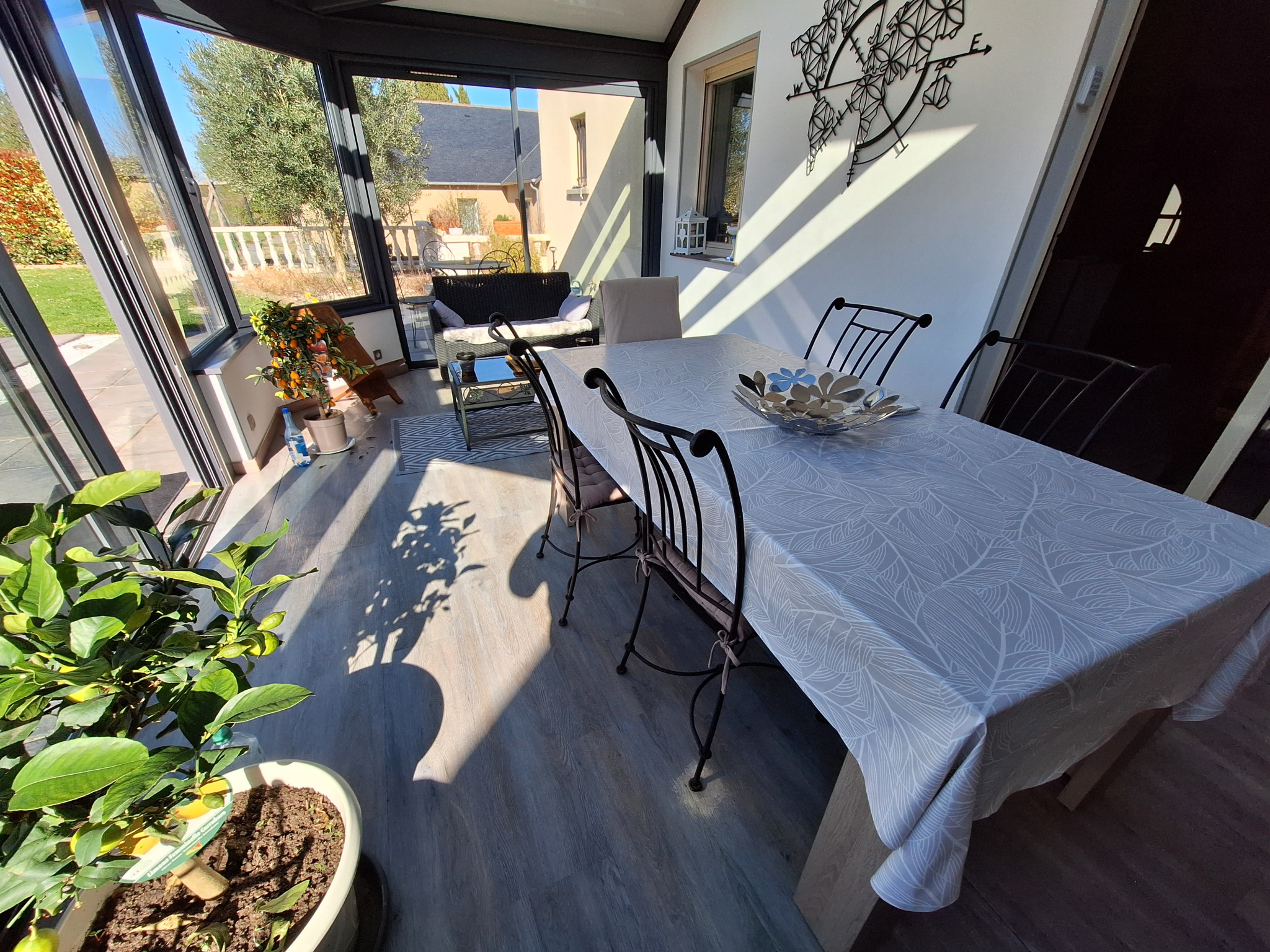 Une agréable véranda donne accès à un jardin avec piscine chauffée de 6 x 4 m. À l'étage, un palier dessert trois chambres spacieuses avec placards intégrés et parquet flottant, une salle de bain et un WC.