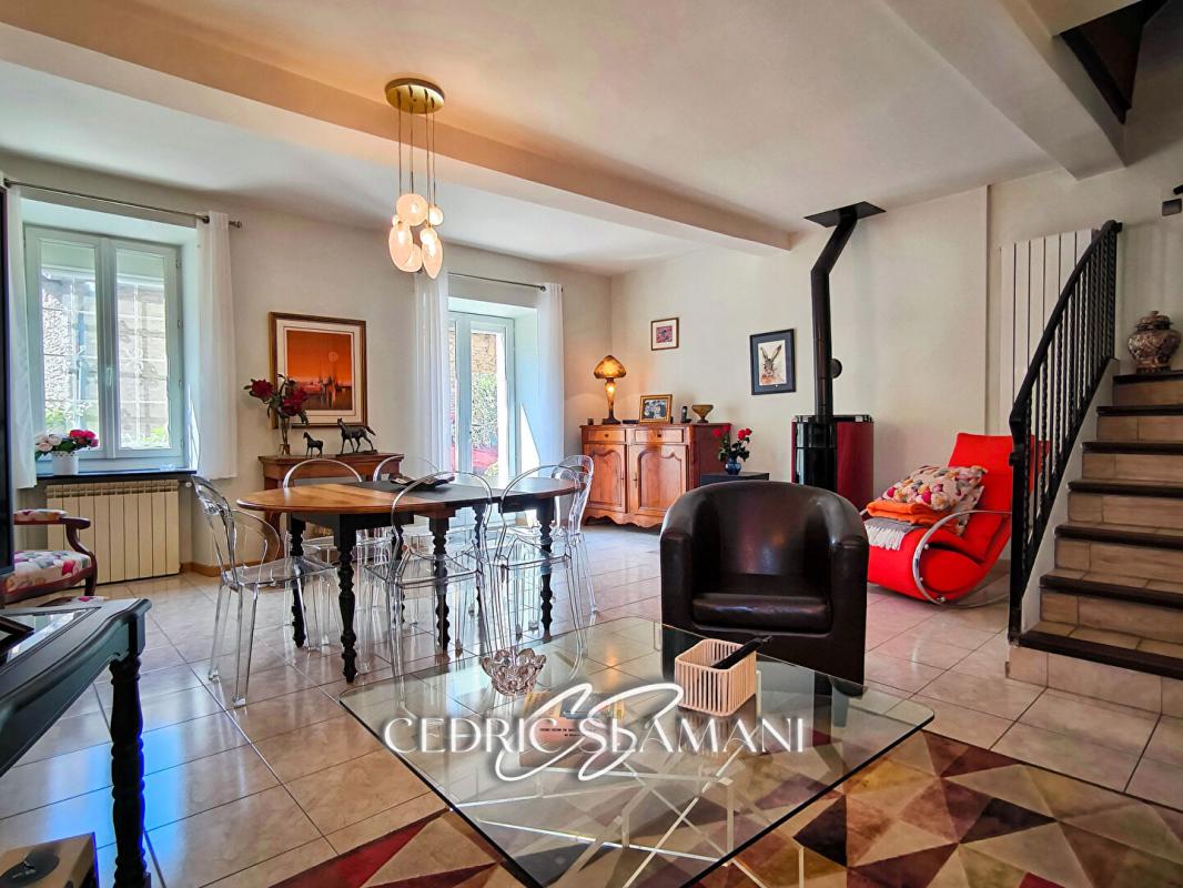 Le salon, baigné de lumière, s'ouvre généreusement sur l'espace de vie. Un poêle à granulés y apporte une chaleur douce, enveloppante, propice aux soirées d'hiver.
