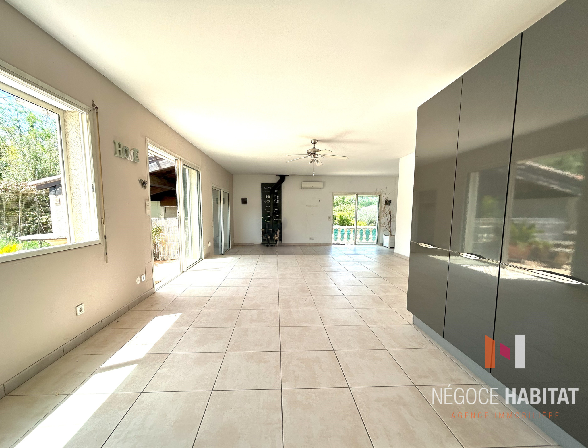 Elle propose une surface habitable de 147,5m2, comprenant une pièce de vie lumineuse de 60 m2 s'ouvrant sur les terrasses et la piscine de 10x5 mètres, 3 chambres, d'une salle de bains et d'un WC.