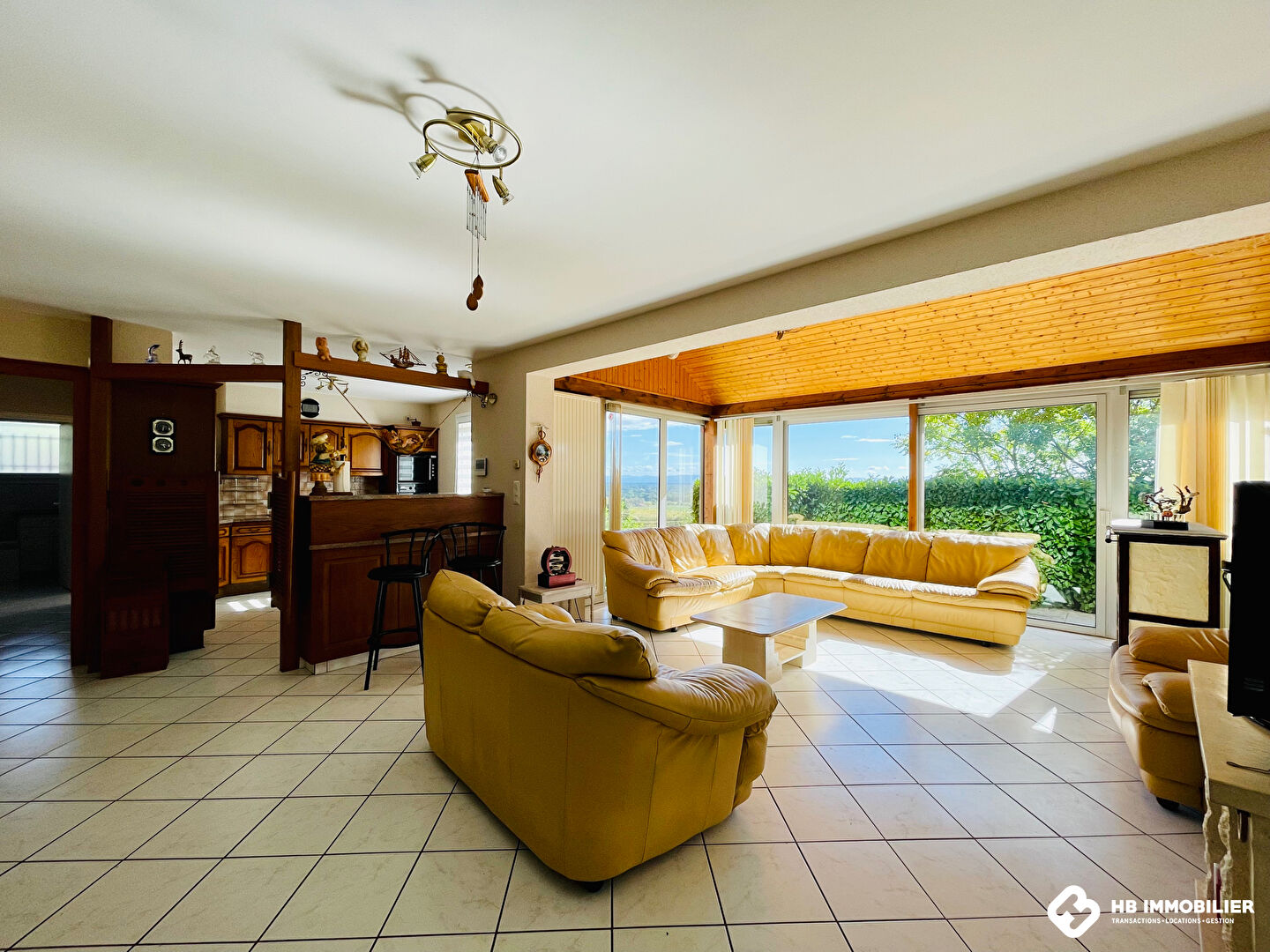Au rez-de-jardin, l'entrée s'effectue par une véranda lumineuse ouvrant sur une vaste pièce de vie d'environ 60 m², baignée de lumière grâce à ses larges ouvertures et offrant une vue dégagée sur le bassin roannais. Cet espace comprend un séjour double avec cheminée à foyer fermé, une salle à manger et une cuisine américaine aménagée et équipée.