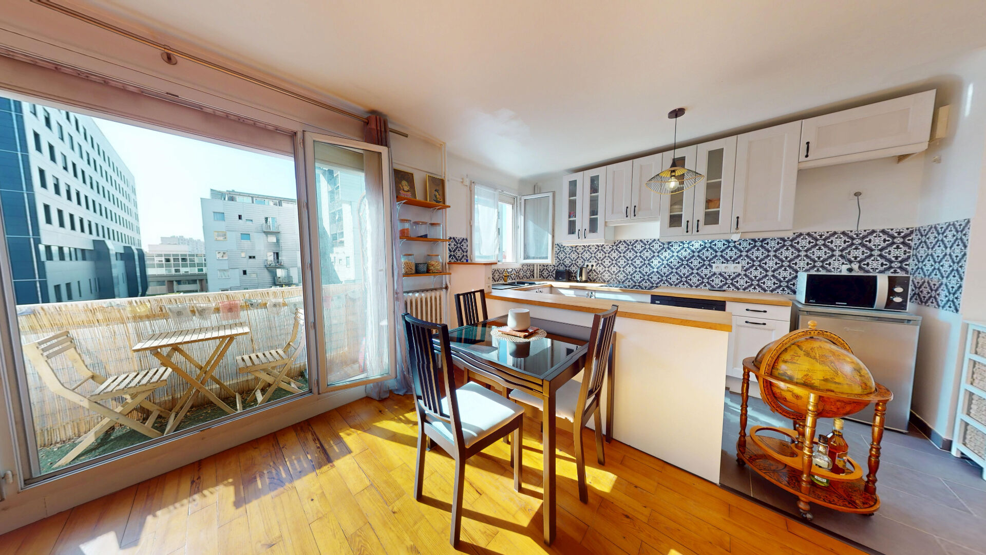 Cuisine semi-ouverte, aménagée et équipée, avec un beau carrelage au sol et en crédence. Fonctionnelle, elle bénéficie également d'une exposition Ouest, idéale pour préparer les repas dans un environnement lumineux.