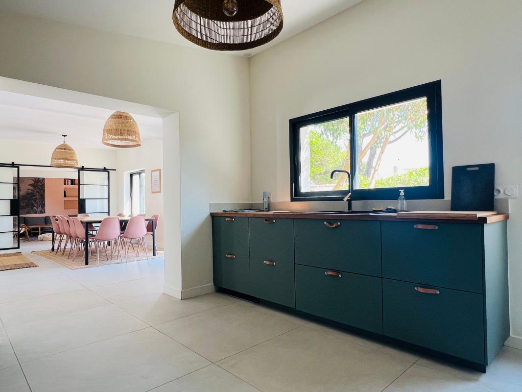 Offrant une entrée sur une pièce de vie spacieuse et lumineuse avec coin coin cuisine aménagé et équipé, arrière cuisine - buanderie, ouvrant sur la terrasse et la piscine, un salon ouvert sur une seconde terrasse.