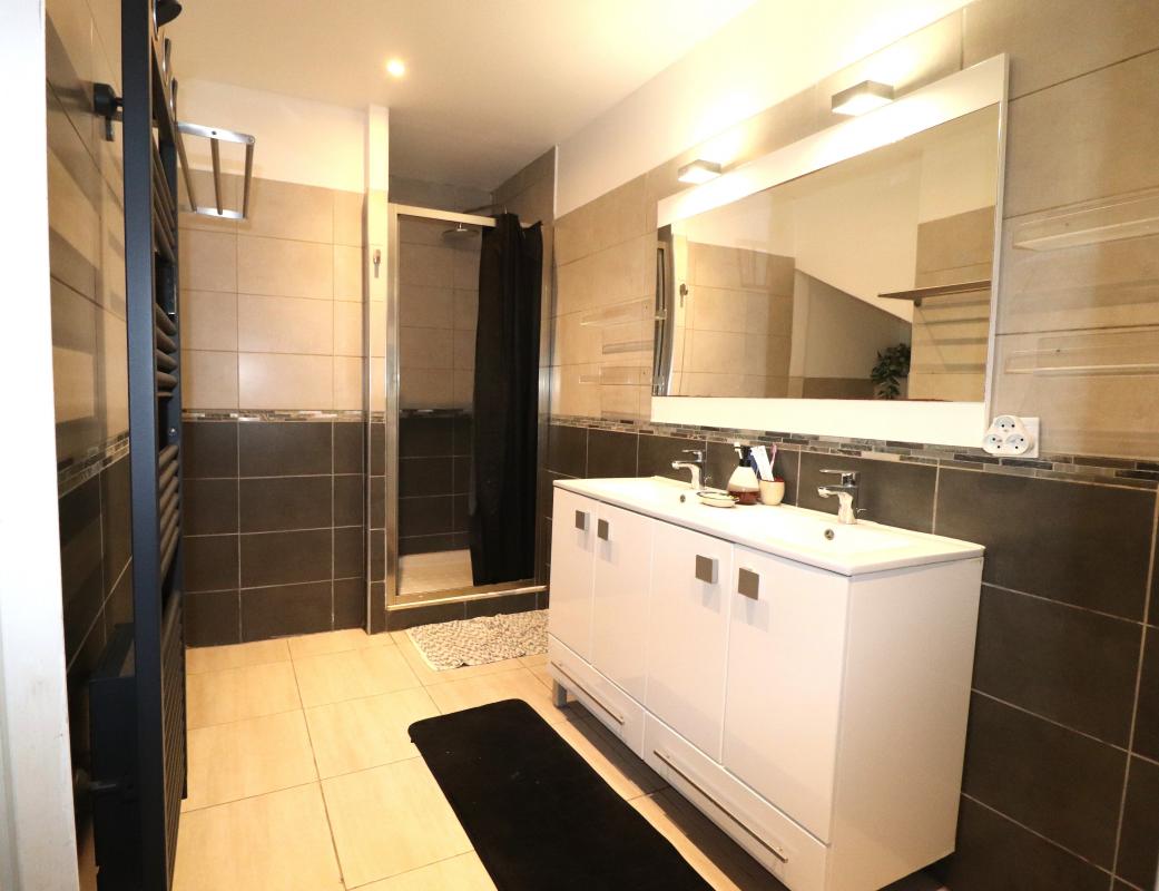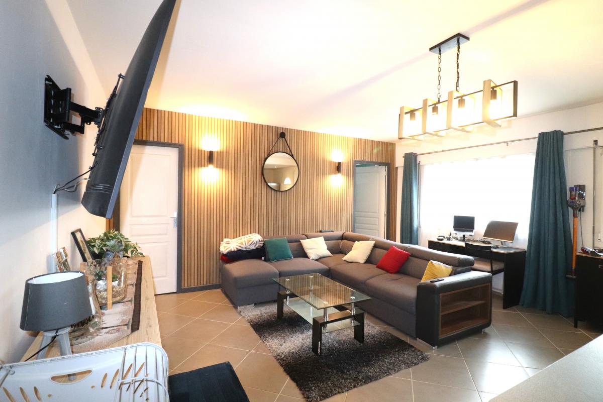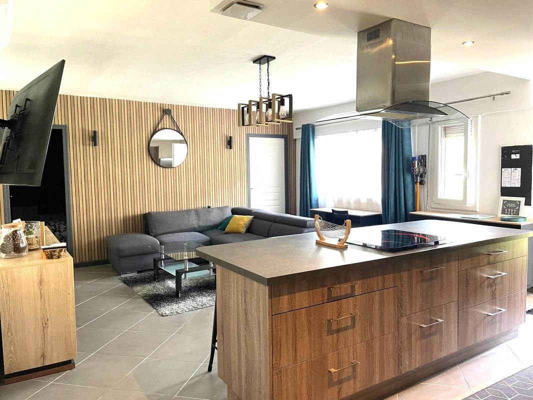 Un spacieux séjour avec une cuisine ouverte aménagée et ilot central. deux chambres, une salle d'eau avec coin WC.