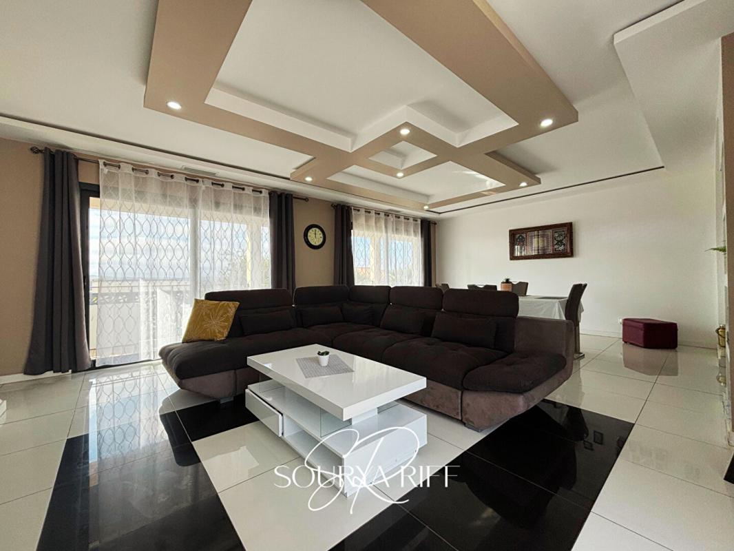 Le grand salon séjour lumineux est idéal pour des moments de convivialité et s'ouvre sur un extérieur soigné.