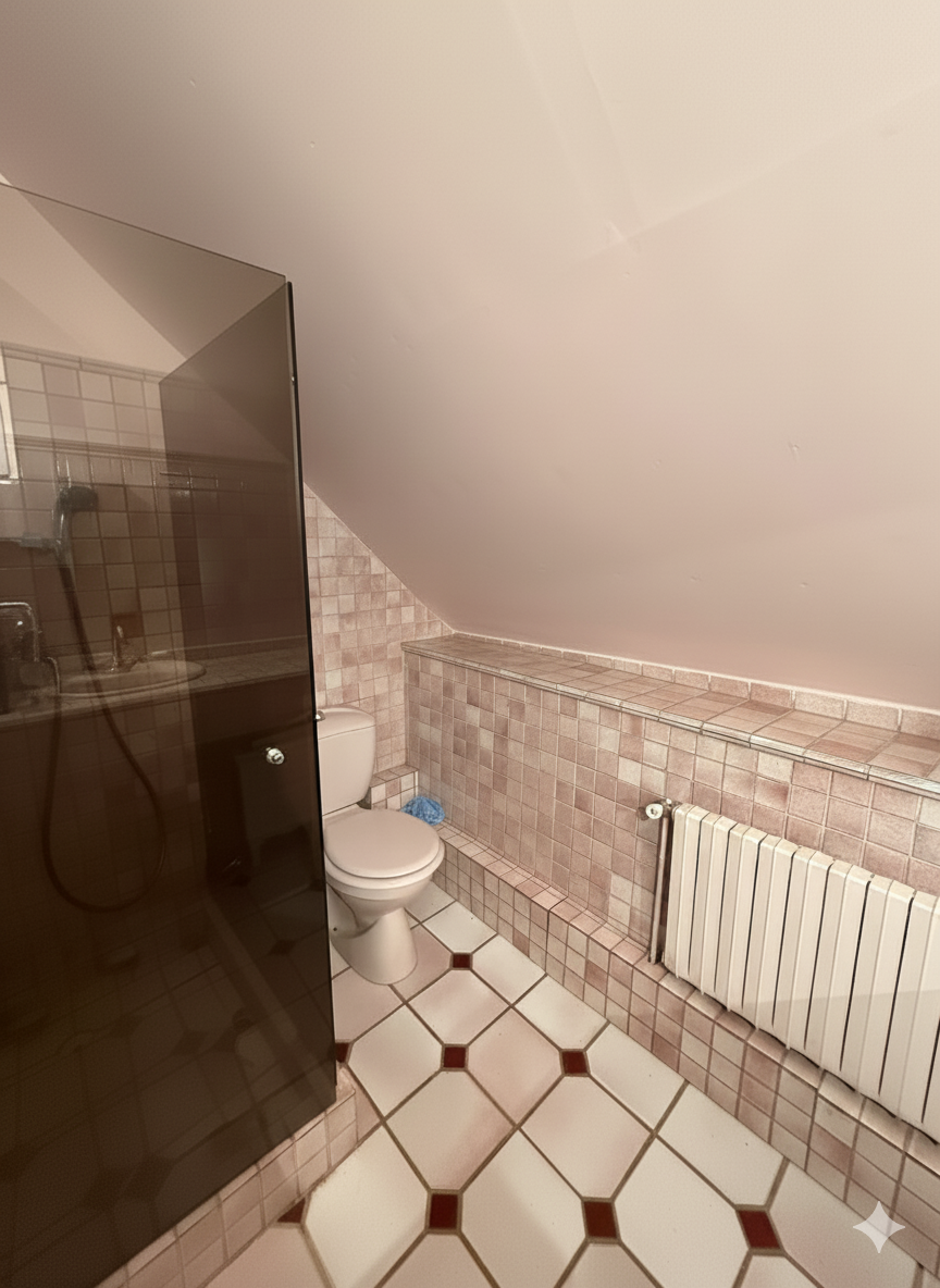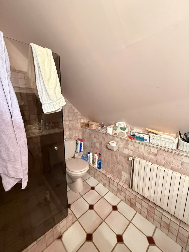 À l'étage, un palier parqueté mène à deux belles chambres et une salle d'eau avec wc.