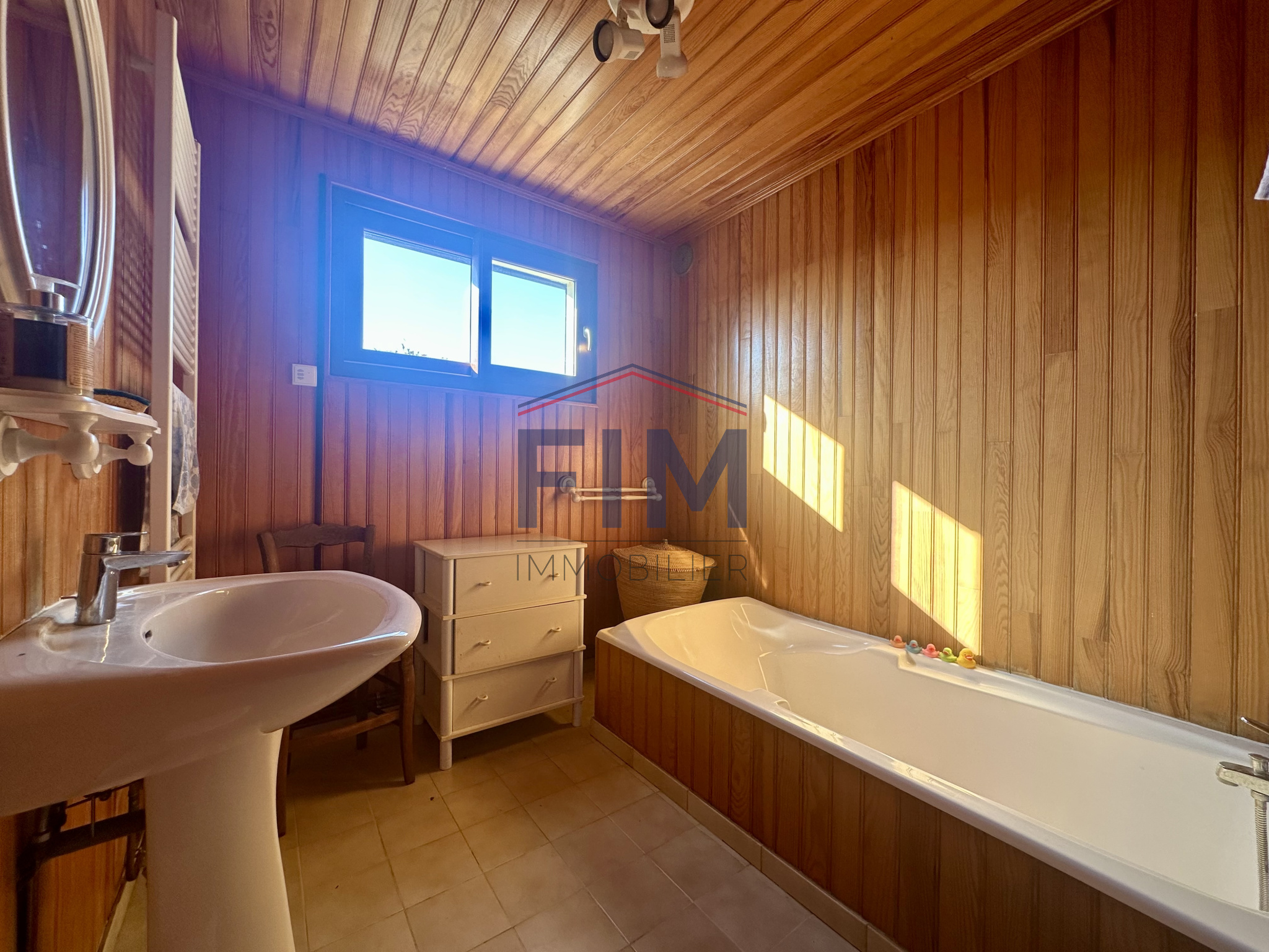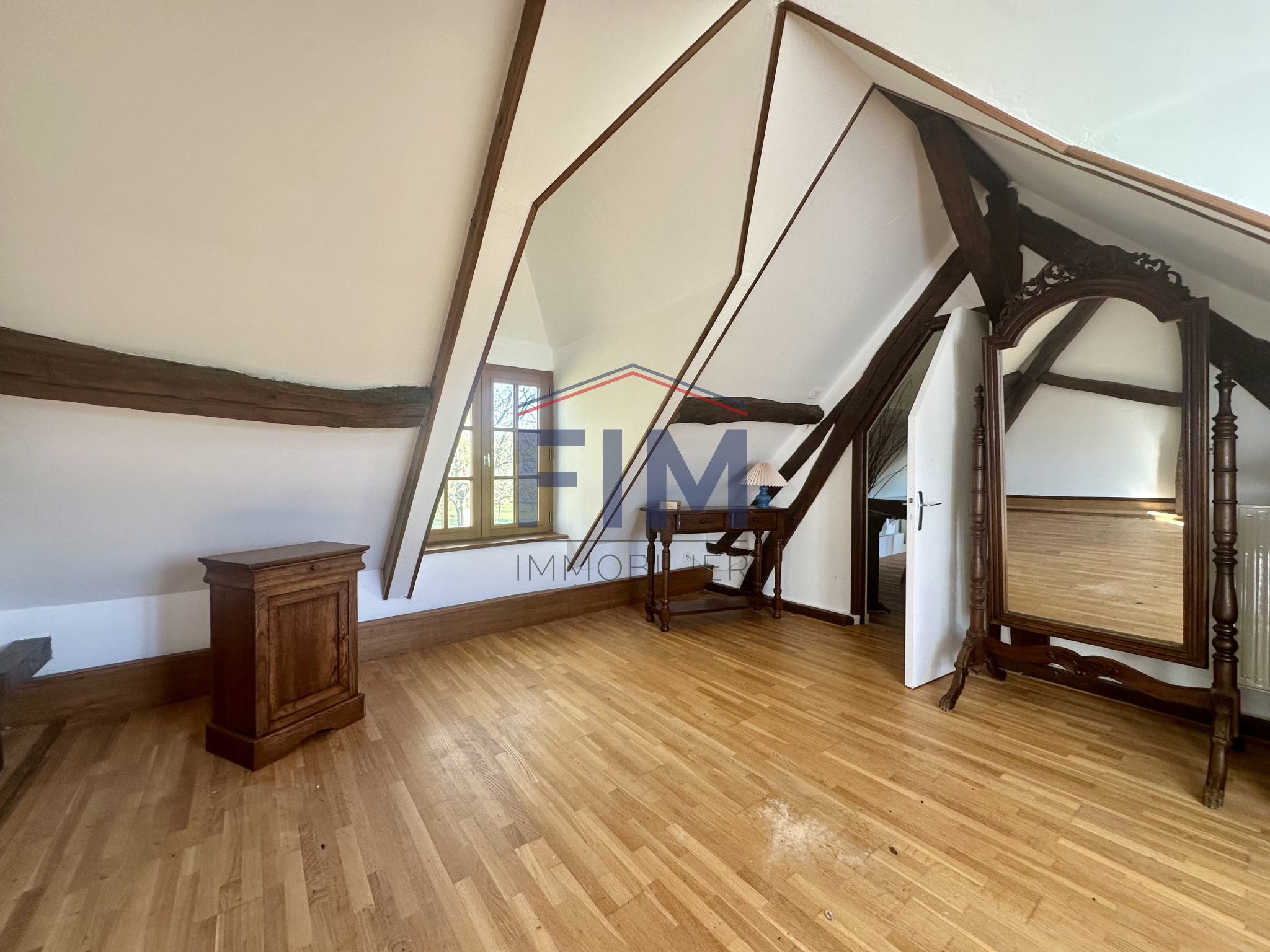 À l'étage, un palier distribue deux chambres, dont une avec balcon, ainsi qu'une salle d'eau.