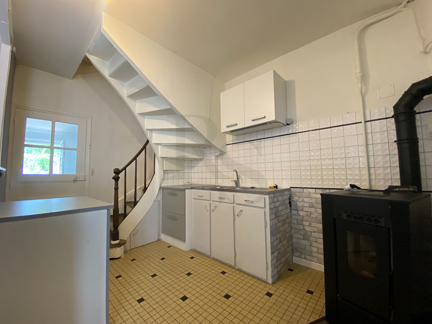 Au rdc : salon-séjour, cuisine aménagée ouverte avec poêle à granulés, WC.