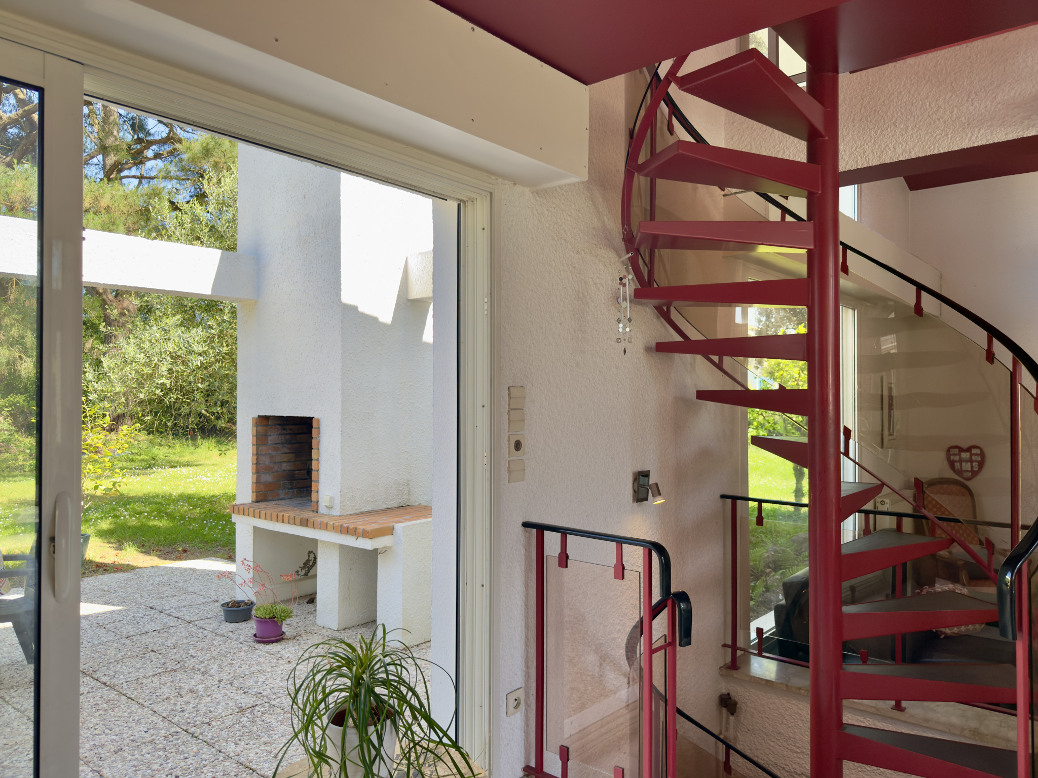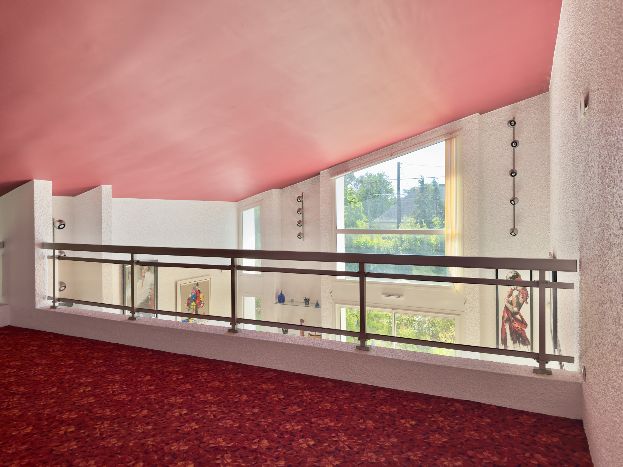 BOUGUENAIS LES COUETS. Maison des années 70 aux volumes atypiques et au charme affirmé, installée sur une grande parcelle arborée d'environ 1400 m2. Fidèle à l'esprit architectural de l'époque, elle séduit par ses jeux de niveaux, la lumière naturelle omniprésente et son plafond cathédrale dans la pièce de vie, qui s'ouvre largement grâce à une double exposition sur deux terrasses. Vous aimez le contemporain ? Cette maison est faite pour vous : clarté et volumes généreux vous séduiront dès le hall d'entrée. La réception dispose d'une mezzanine suspendue accessible par un escalier hélicoïdal en métal, assurant une circulation fluide et originale entre les espaces. Ajoutez à cela un coin salon décaissé autour d'un insert, pour une ambiance chaleureuse et conviviale. Côté nuit, vous trouverez trois chambres dont une suite parentale avec sa salle de bains privative, plus une salle d'eau. Un studio indépendant avec entrée privative complète l'ensemble : idéal pour accueillir, louer ou télétravailler en toute tranquillité. Côté confort, la maison est équipée d'une pompe à chaleur ainsi que d'une chaudière gaz, alliant performance énergétique et bien-être. La possibilité de stationner plusieurs véhicules devant la propriété ajoute à la fonctionnalité globale de ce bien au caractère unique. Une maison à l'identité forte, pour les amateurs d'espaces atypiques et de caractère.