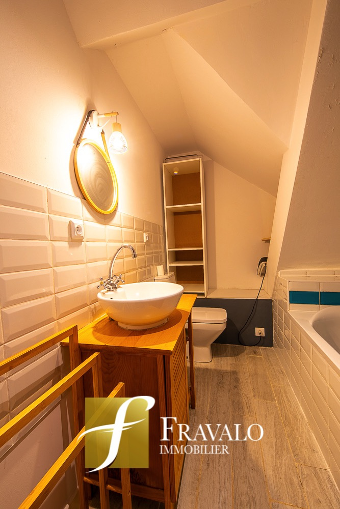 Charmante maison en pierre de 100 m2 idéalement située au coeur du bourg de Baden. Le rez-de-chaussée vous offre une entrée, une cuisine ouverte sur un salon-séjour avec poêle à bois, une chambre avec salle d'eau et un wc. A l'étage, le palier dessert deux chambres avec salle d'eau avec wc. L'ensemble vous est proposé sur un terrain d'environ 300 m2. Estimation des coûts annuels d'énergie pour un usage standard du logement: entre 1550 EUR et 2140 EUR (abonnement compris). Les informations sur les risques auxquels ce bien est exposé sont disponibles sur le site Géorisques : georisques.gouv.fr