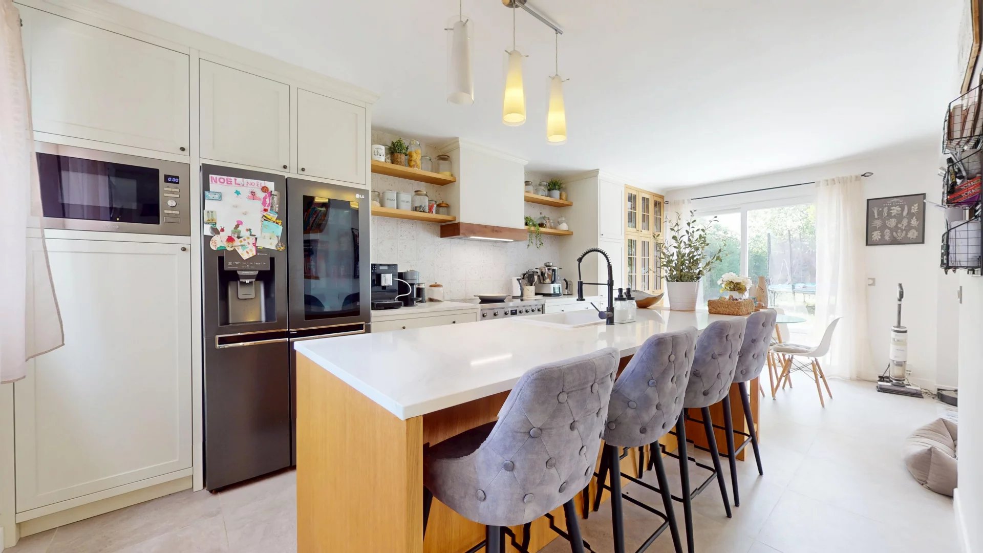 Rez-de-chaussée : Une entrée avec placard dessert un vaste espace de vie de 57 m², baigné de lumière, composé d’un séjour et d’une cuisine ouverte sur mesure (2021), avec accès direct à une superbe terrasse en travertin de 40 m², sans vis-à-vis, équipée de deux grands stores bannes. Le jardin arrière au calme est idéal pour les enfants. Vous trouverez également sur ce niveau un WC avec lave-mains et une chambre de 10 m².