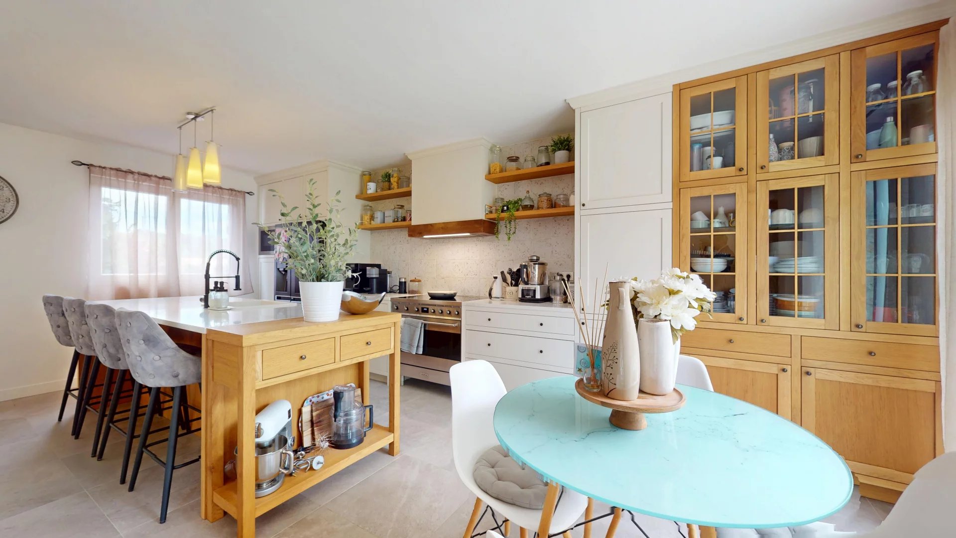 À l’étage : Un palier dessert un bureau, trois chambres, dont une suite parentale de 20 m² avec dressing et salle d’eau, ainsi qu’une salle de bains familiale avec WC.