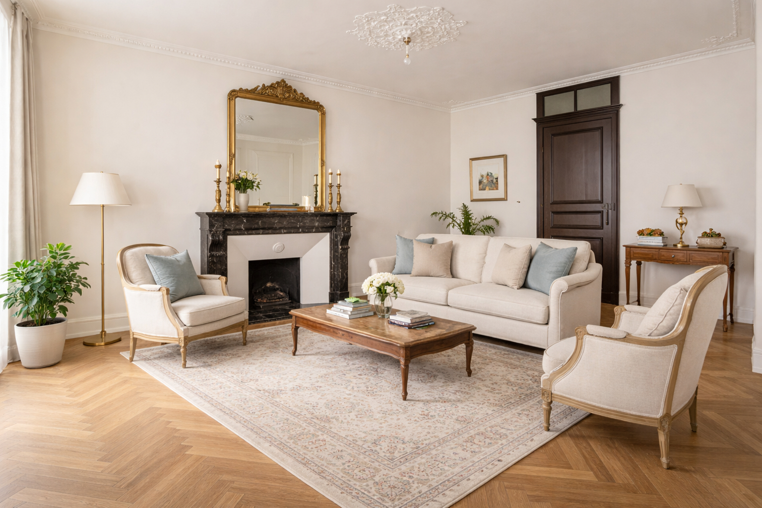 Charme de l'ancien conservé : escaliers en bois, moulures d'époque, poutres apparentes, carreaux de faïence.