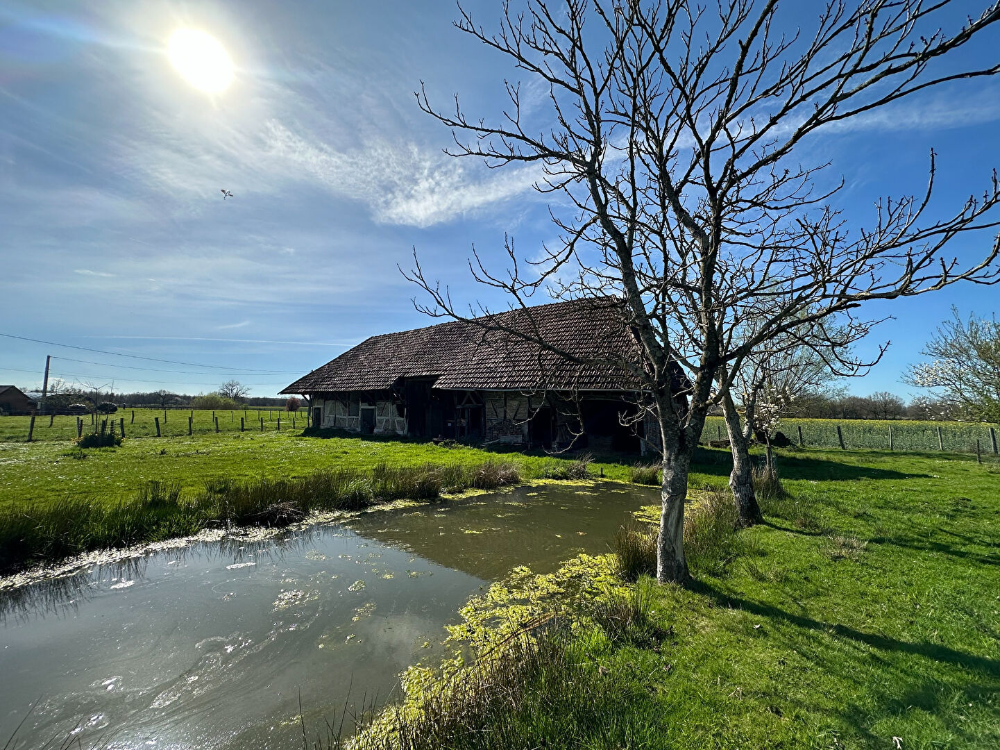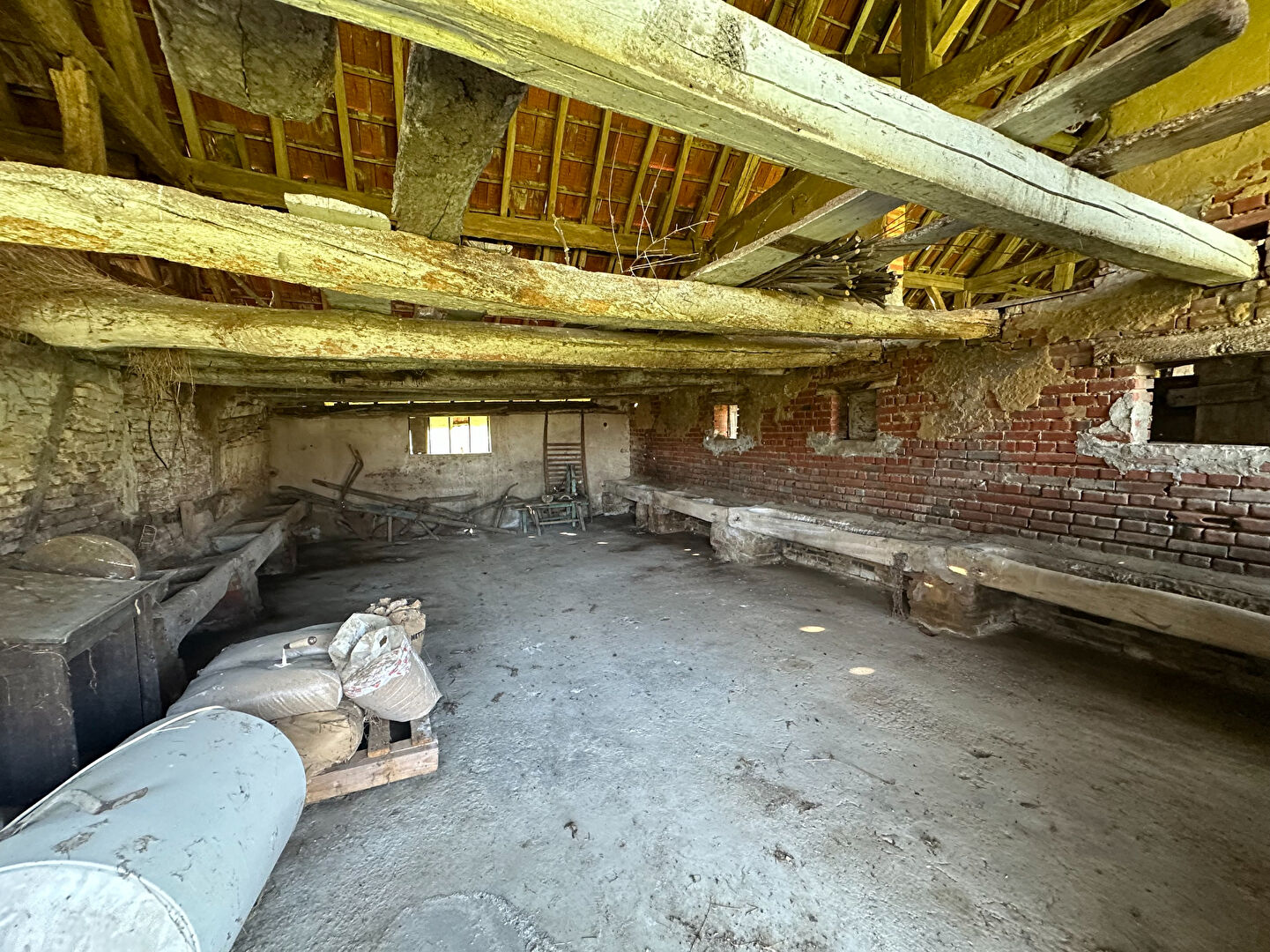 Au calme, au bord d'une impasse, typique corps de ferme bressan datant de 1730, comprenant : - une maison d'habitation à colombages et briquettes, dont le gros oeuvre est en bon état (murs, charpente, toiture, sous-toiture et isolation), le second oeuvre est à prévoir, offrant 188 m² sur deux niveaux, trois grandes pièces de vie en plain-pied avec sols en tomettes, double cheminée ; à l'étage, vaste comble aménageable (permis de construire délivré). - Un bâtiment d'hébergeage avec écuries, étable, deux granges. - Une dépendance avec trois tecks et atelier. Puits, mare, verger sur 4 529 m² de terrain.