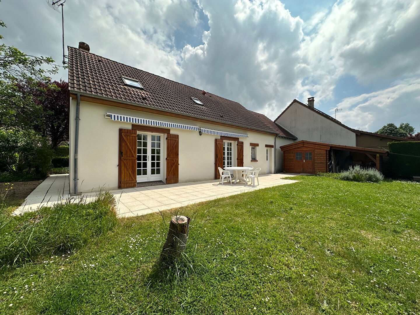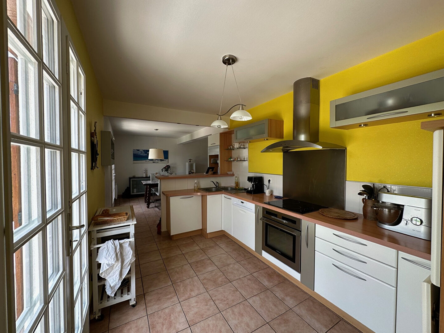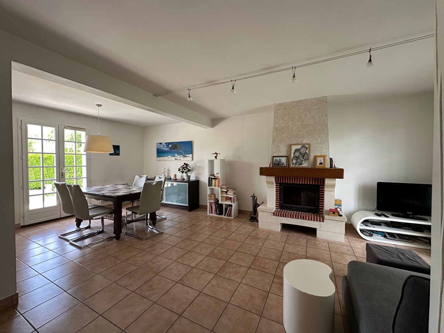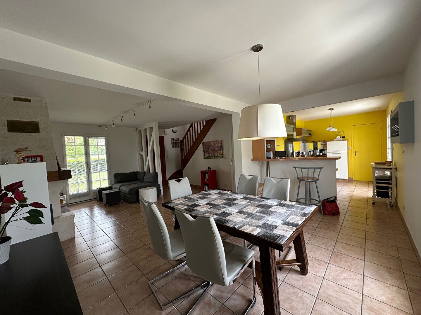 Au rez de chaussée, une pièce à vivre traversante avec cheminée, cuisine ouverte équipée et accès terrasse donnant sur un agréable jardin clos de 740m² sans vis-à-vis.