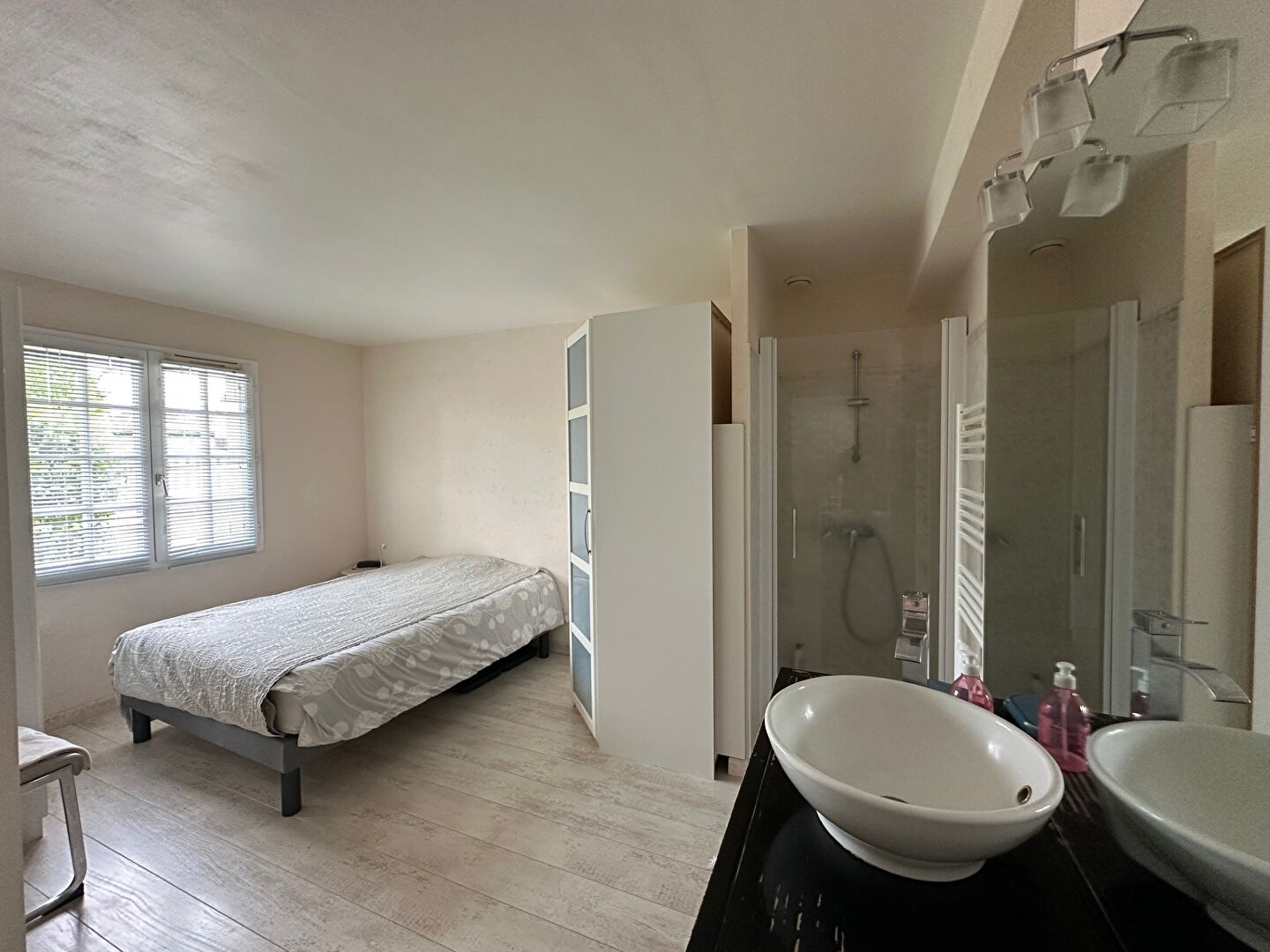 Une chambre avec salle de douche privative, lingerie et remise avec placards.