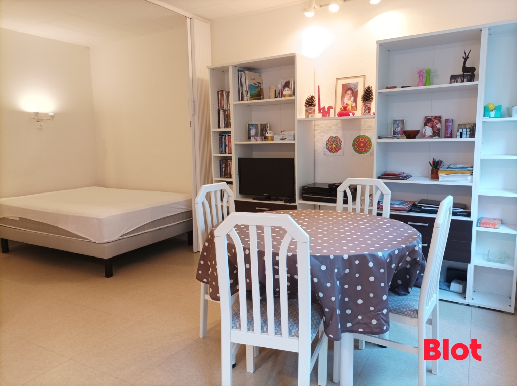 En rez-de-jardin, ce bien se compose d'une entrée avec placards, d'un séjour lumineux de plus de 21 m², modulable avec un espace nuit, d'une chambre avec rangements, d'une salle d'eau avec WC et d'une cuisine séparée, aménagée et équipée.