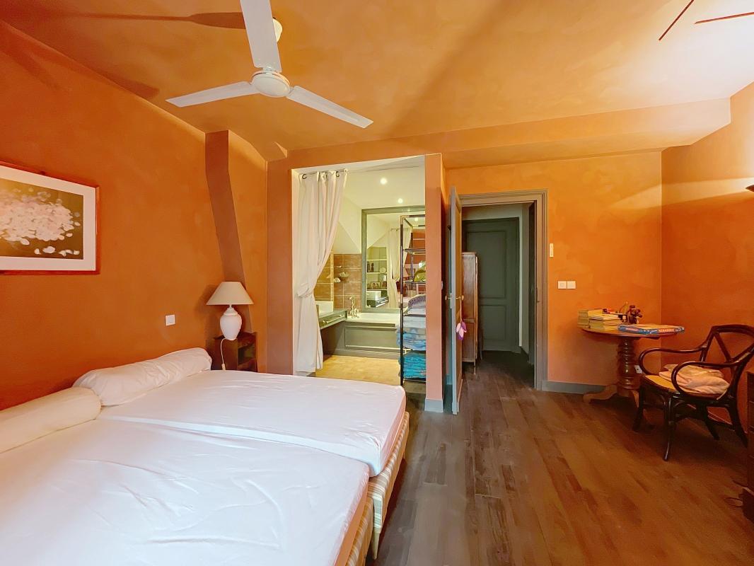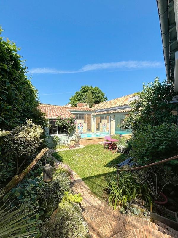 A l'extérieur : une terrasse couverte donnant sur un magnifique jardin intimiste sans aucun vis-à-vis et avec sa piscine chauffée