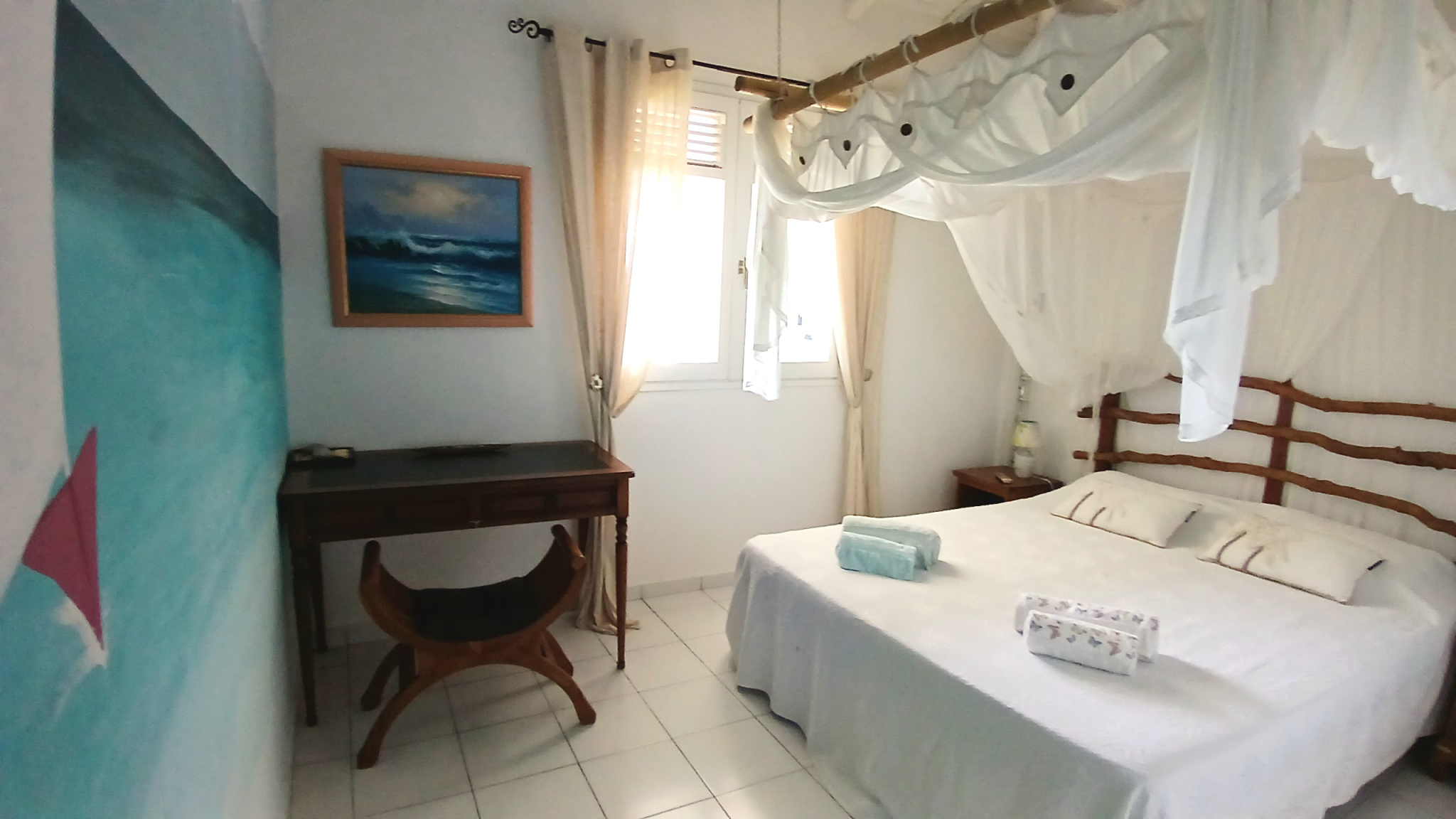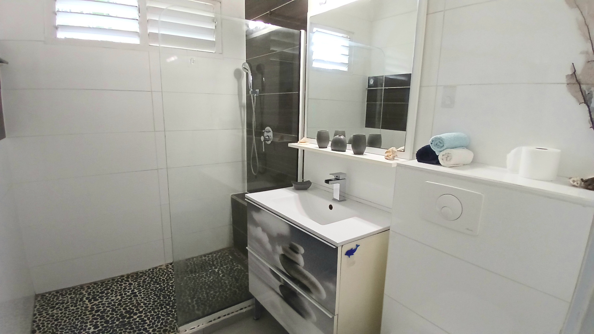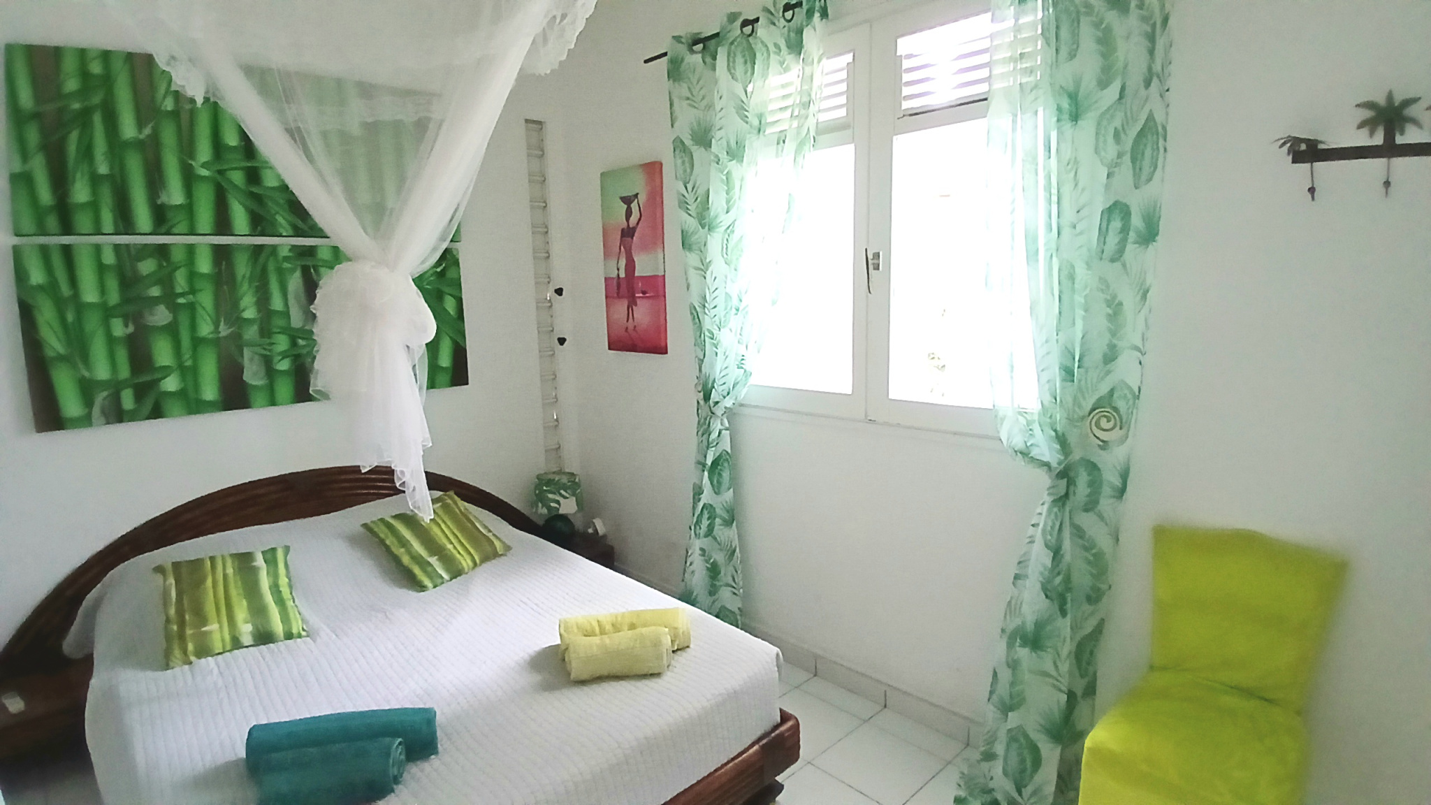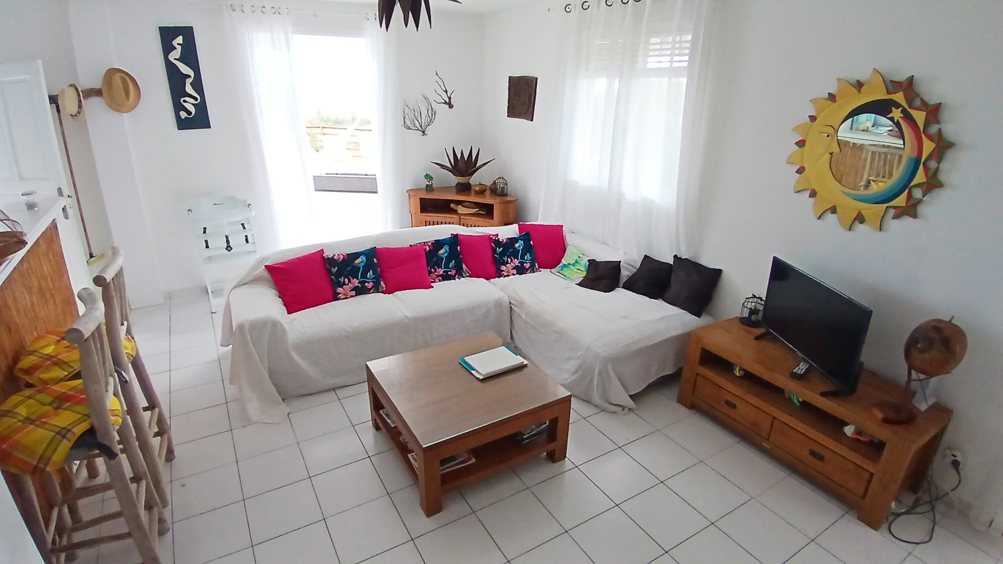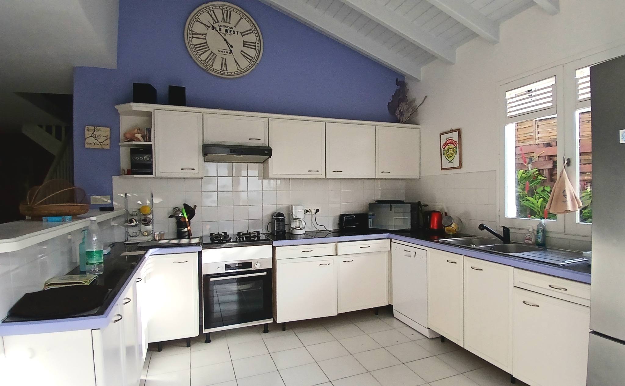 La parcelle est joliment arborée, close avec deux entrées indépendantes, un atelier, deux carports, un carbet et une piscine au sel.