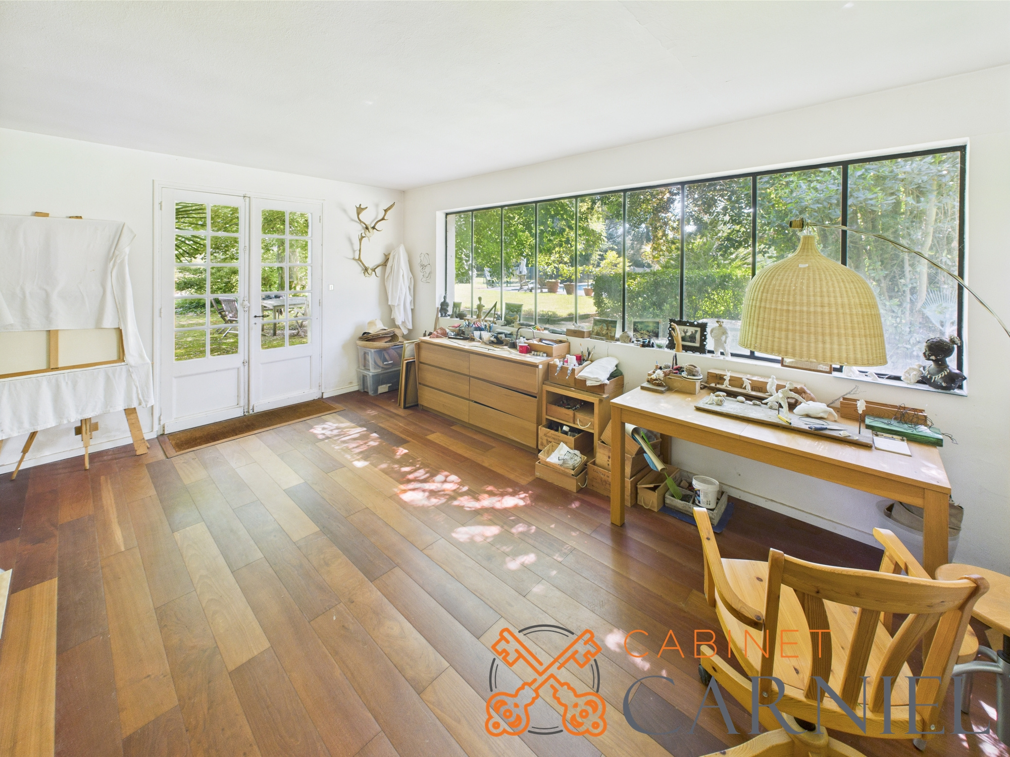 Avec une superficie habitable d'environ 360 m2, cette demeure se compose de 10 pièces réparties sur deux niveaux. Le rez-de-chaussée de 222 m2 propose deux séjours spacieux, un bureau, une cuisine indépendante, une entrée élégante, une buanderie avec douche, une chambre, un atelier d'art baigné de lumière donnant sur la piscine, un WC, ainsi qu'un garage attenant et un second garage extérieur.
