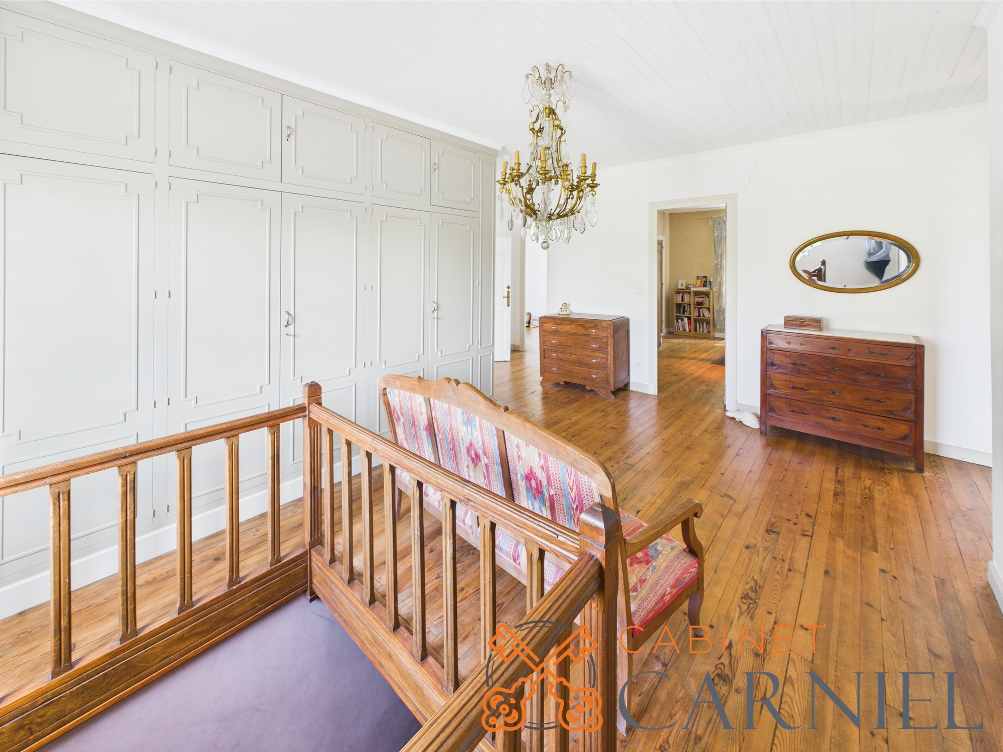 À l'étage, vous découvrirez deux superbes suites parentales de 20 m2, donnant accès à une terrasse généreuse de plus de 100 m2, trois autres chambres de plus de 20 m2 chacune, deux salles de bain dont une avec douche, ainsi qu'un palier central de 25 m2. Le parquet ancien confère à cet étage une ambiance chaleureuse et authentique.
