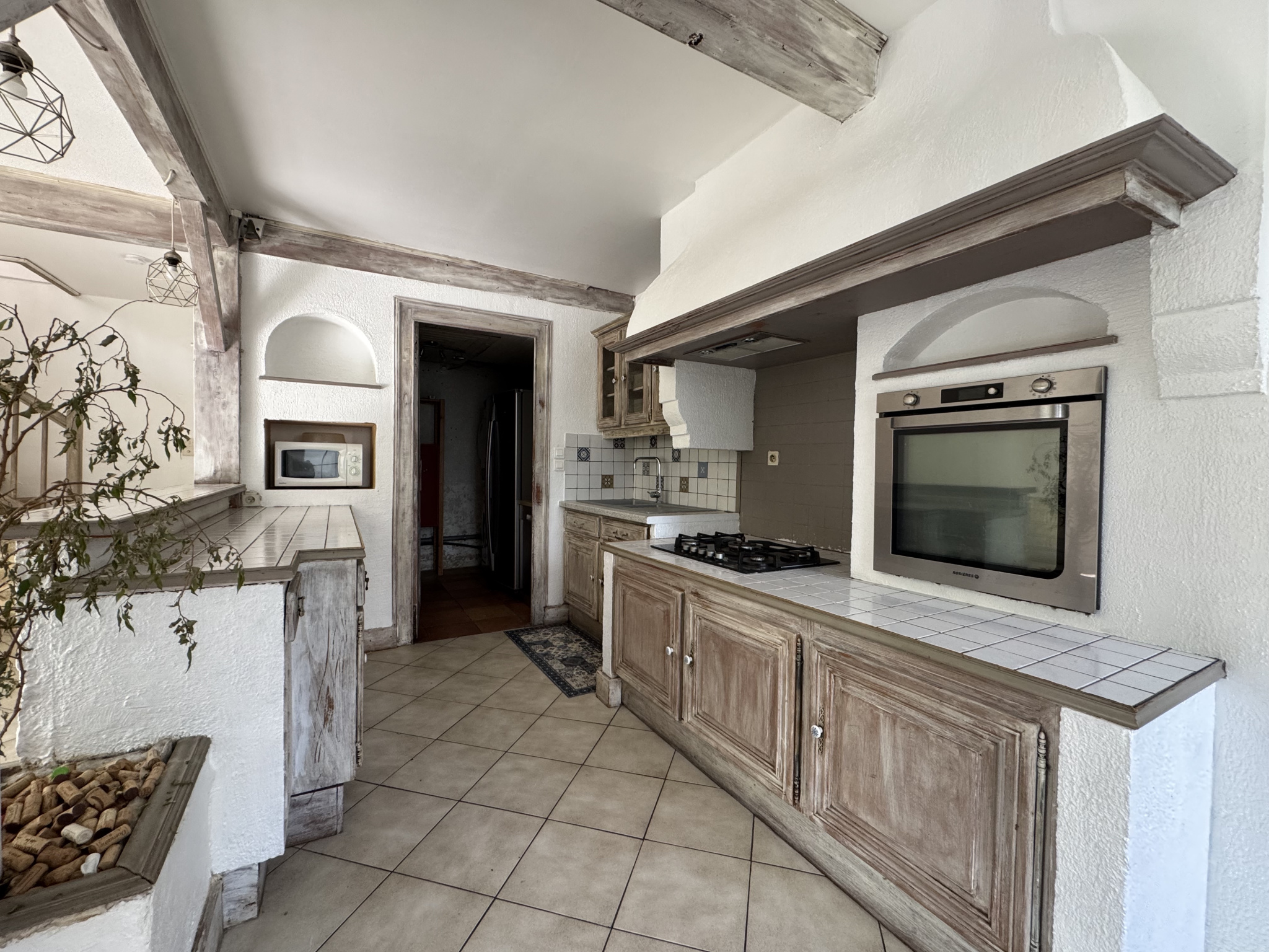 Au rez-de-chaussée, une vaste salle à manger avec cuisine aménagée et équipée, un cellier, un salon avec poêle à granules, une chambre, un wc indépendant, ainsi qu'une pièce de stockage.