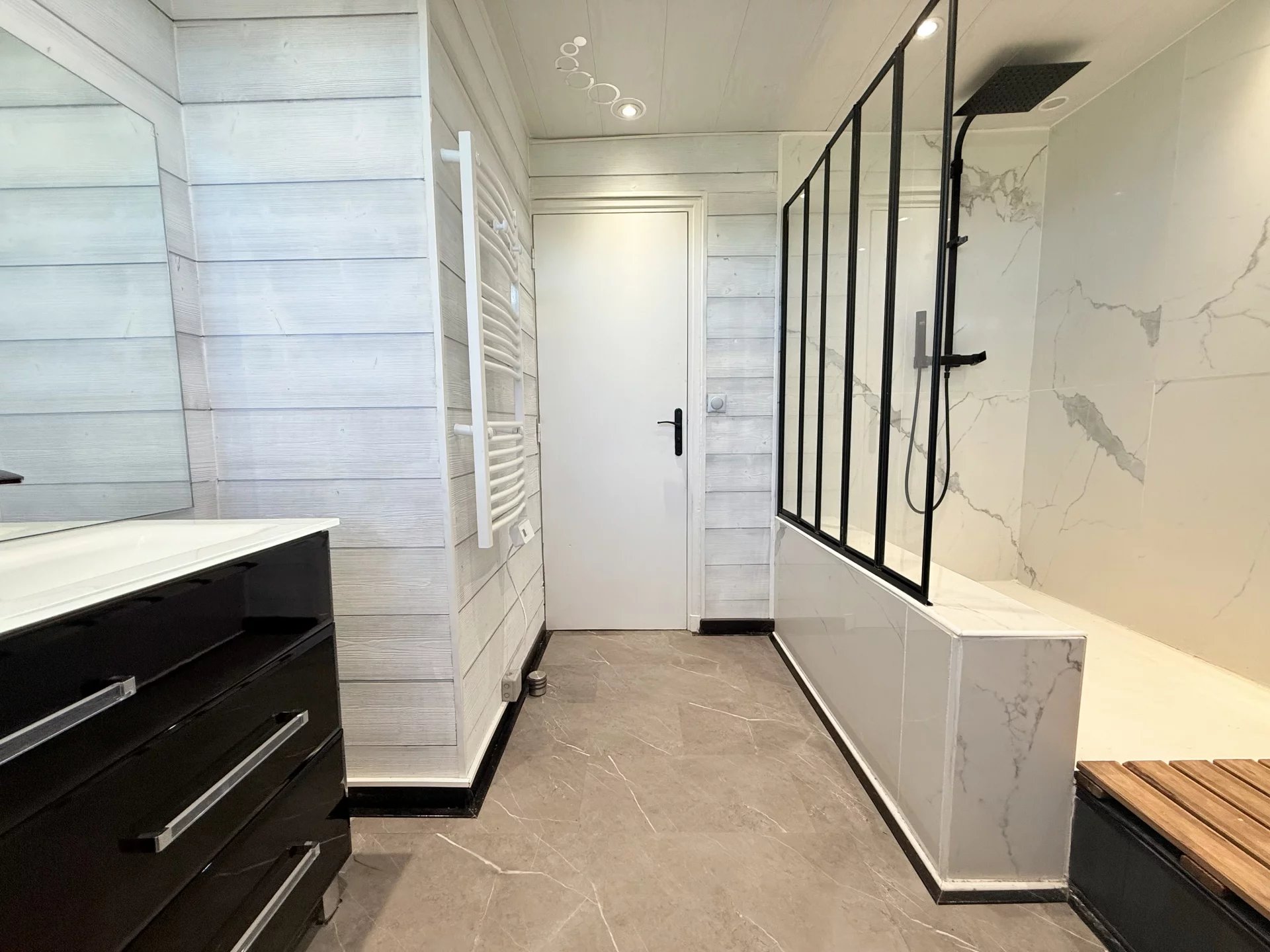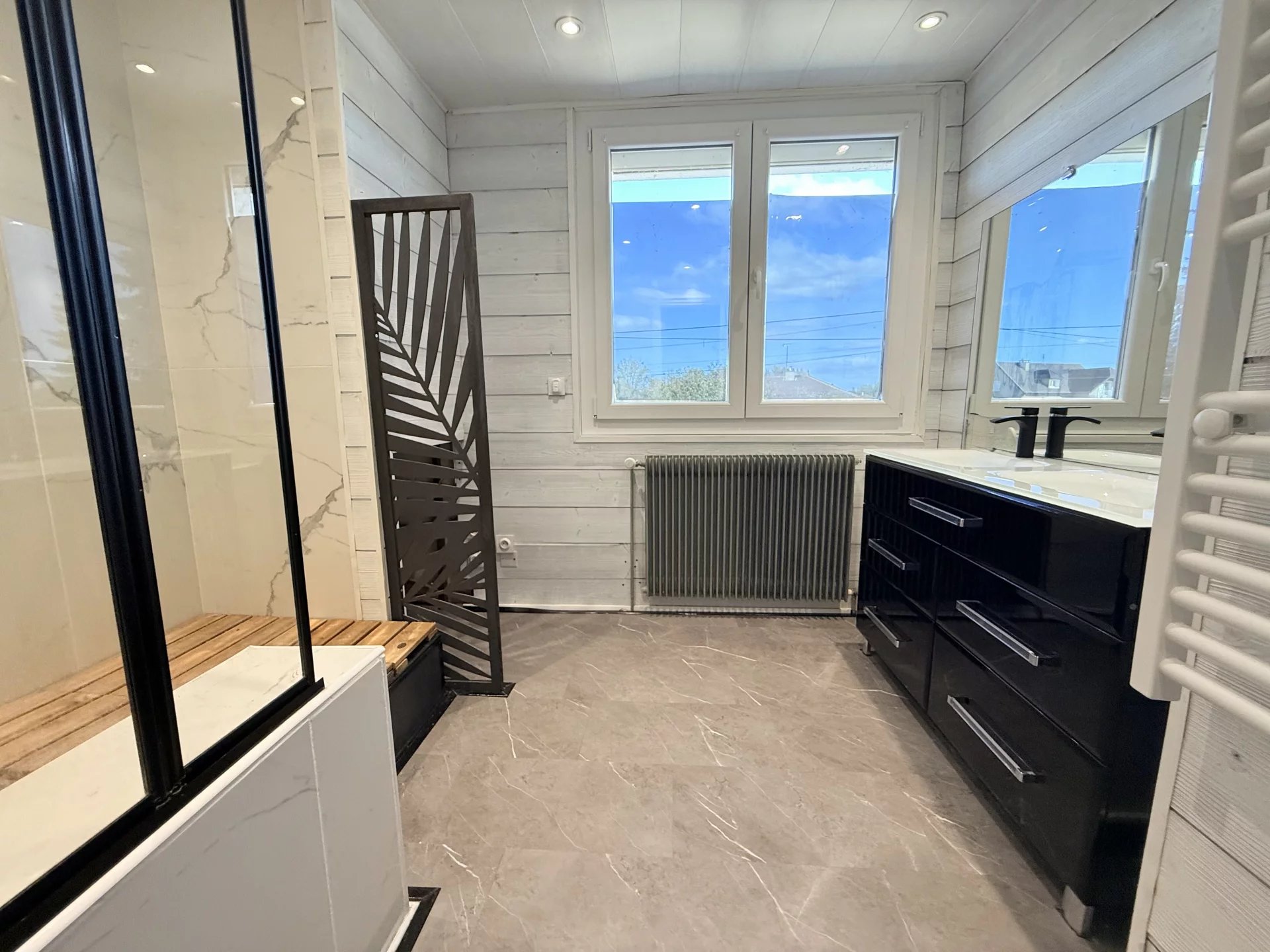 Une salle d'eau avec double vasques de 8.5 m2 et des WC séparé.