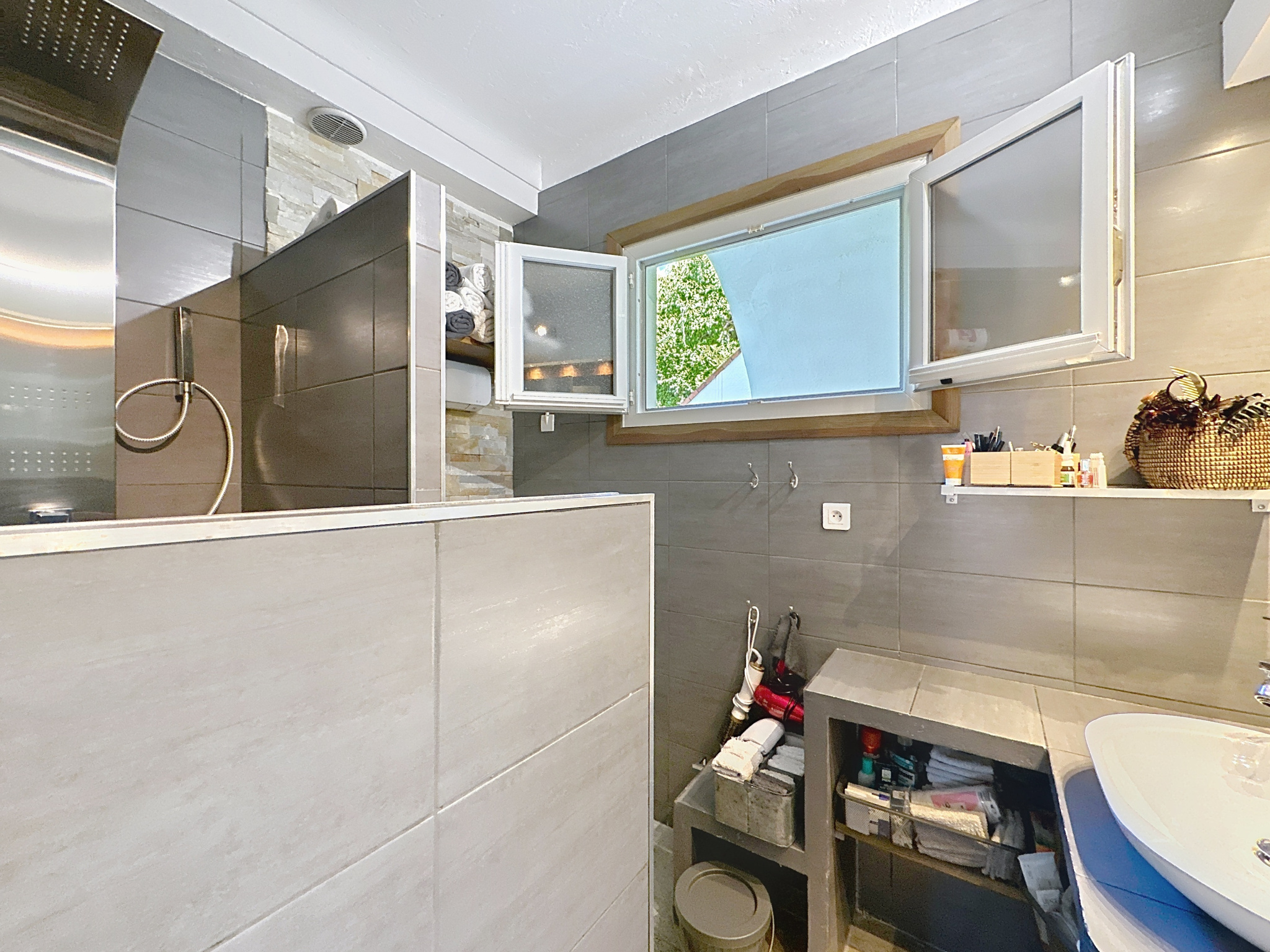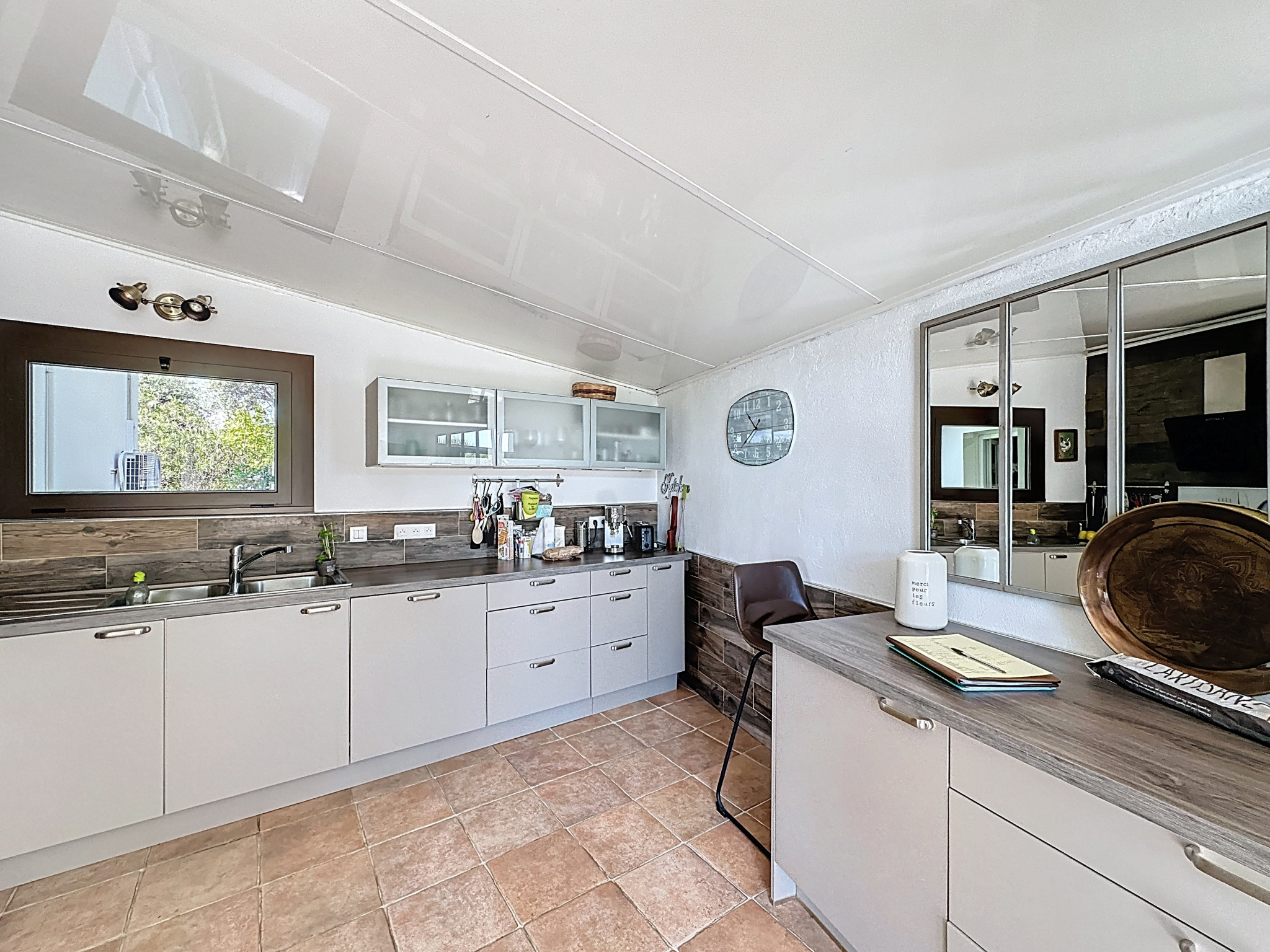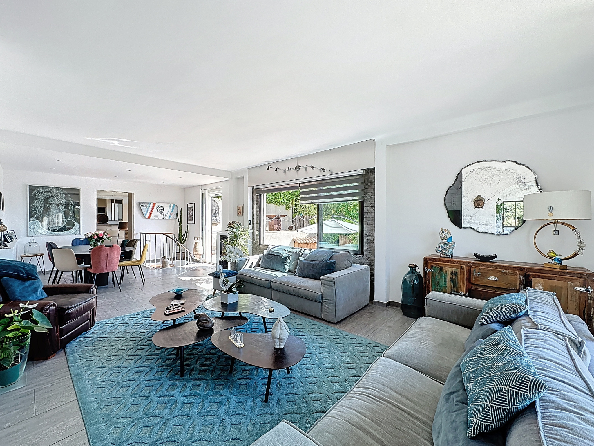 Les extérieurs ont été soigneusement aménagés : une terrasse solarium pour les bains de soleil, une terrasse lounge avec coin repas, une terrasse avec espace jacuzzi, ainsi qu'une planche de terrain en restanque sur le bas, offrant un beau potentiel d'aménagement paysager.