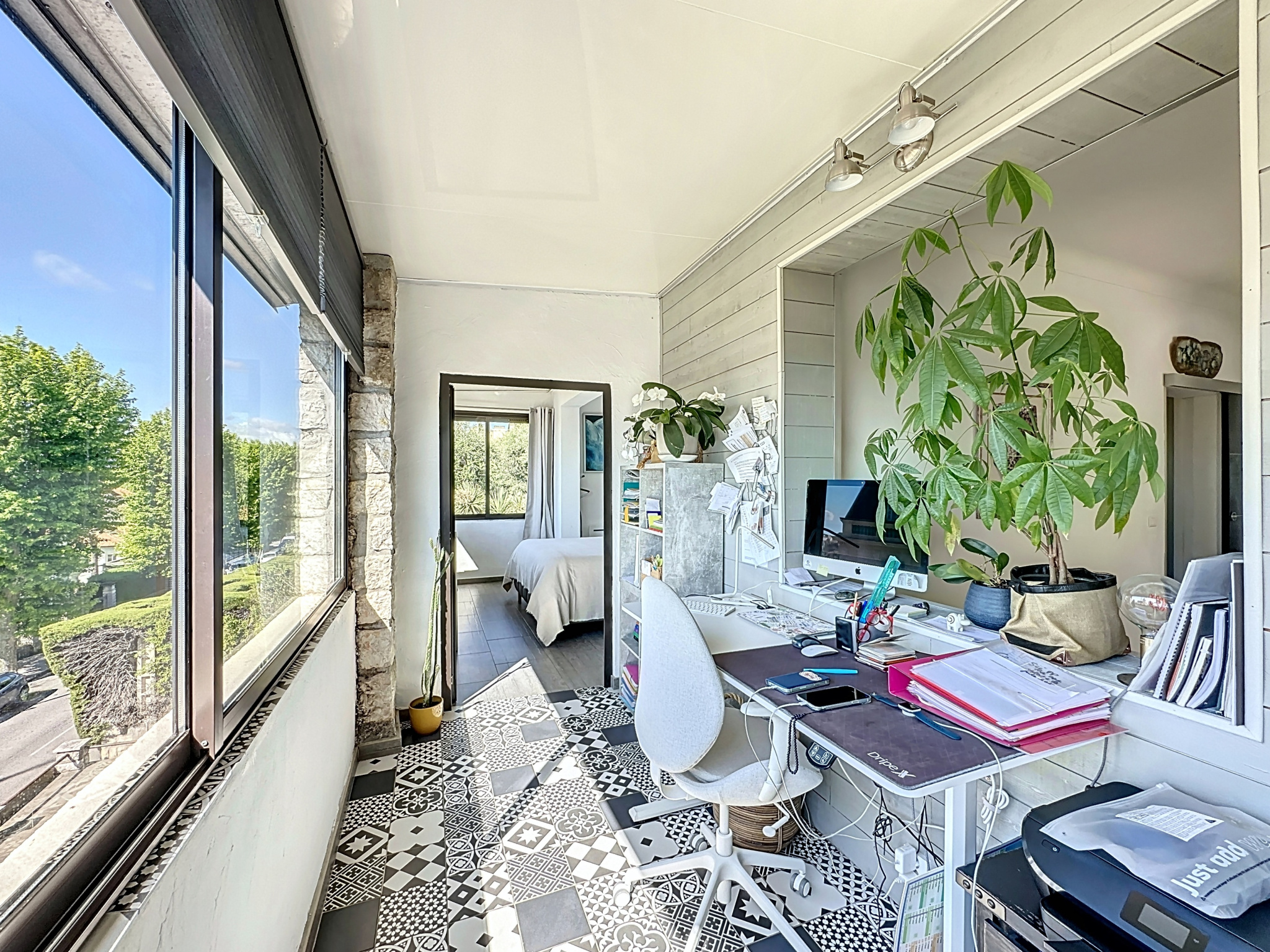 L'intérieur se compose d'un hall d'entrée avec escalier, de trois chambres lumineuses, de deux salles de bains, d'un WC indépendant, d'un vaste séjour/salle à manger de 44 m2 ouvrant sur la terrasse principale, d'un coin bureau discret et d'une cuisine indépendante avec accès direct à une seconde terrasse.