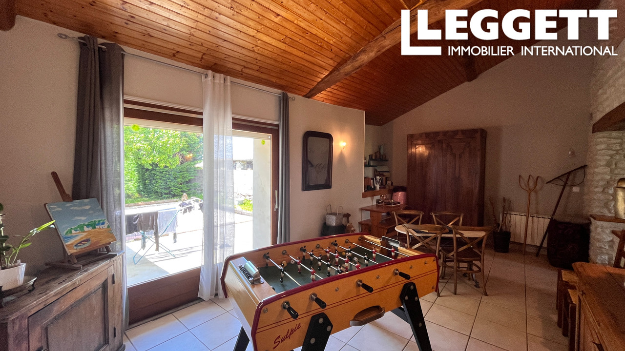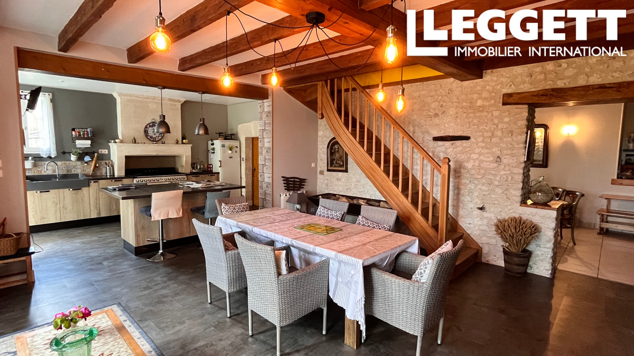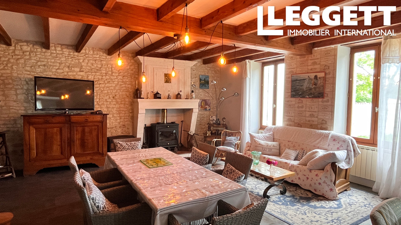 A37093EB16 - Cette jolie maison de caractère de 4 chambres est située dans un hameau paisible aux confins de la Charente et de la Charente Maritime. La propriété est en excellent état et présente de jolis éléments de caractère, notamment des cheminées d'origine, des poutres et des pierres apparentes.
