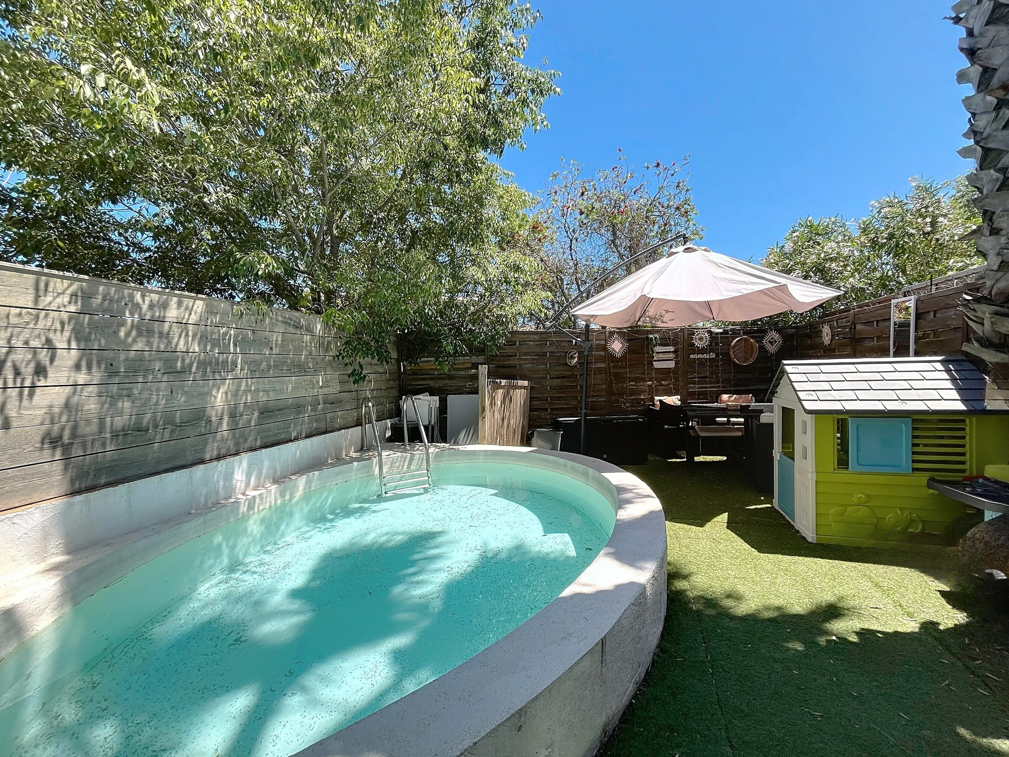 A l'extérieur, une terrasse cosy d'environ 32 m2 avec un bassin pour se rafraîchir à l'ombre du palmier qui confère à ce bien son côté unique.